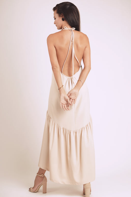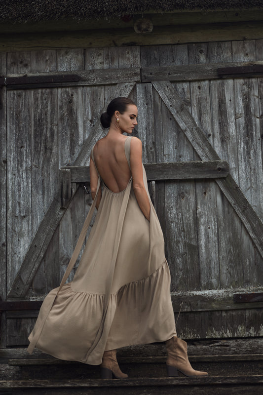 Gara volānkleita ar atsegtu muguras daļu un dekoltē šķēlumu