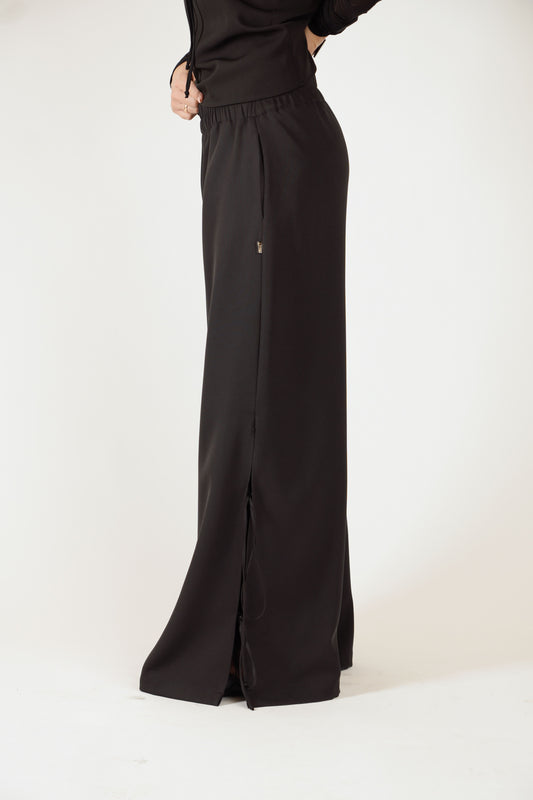 Melnas platas bikses ar šķēlumiem, gumijas jostu un sānu kabatām
