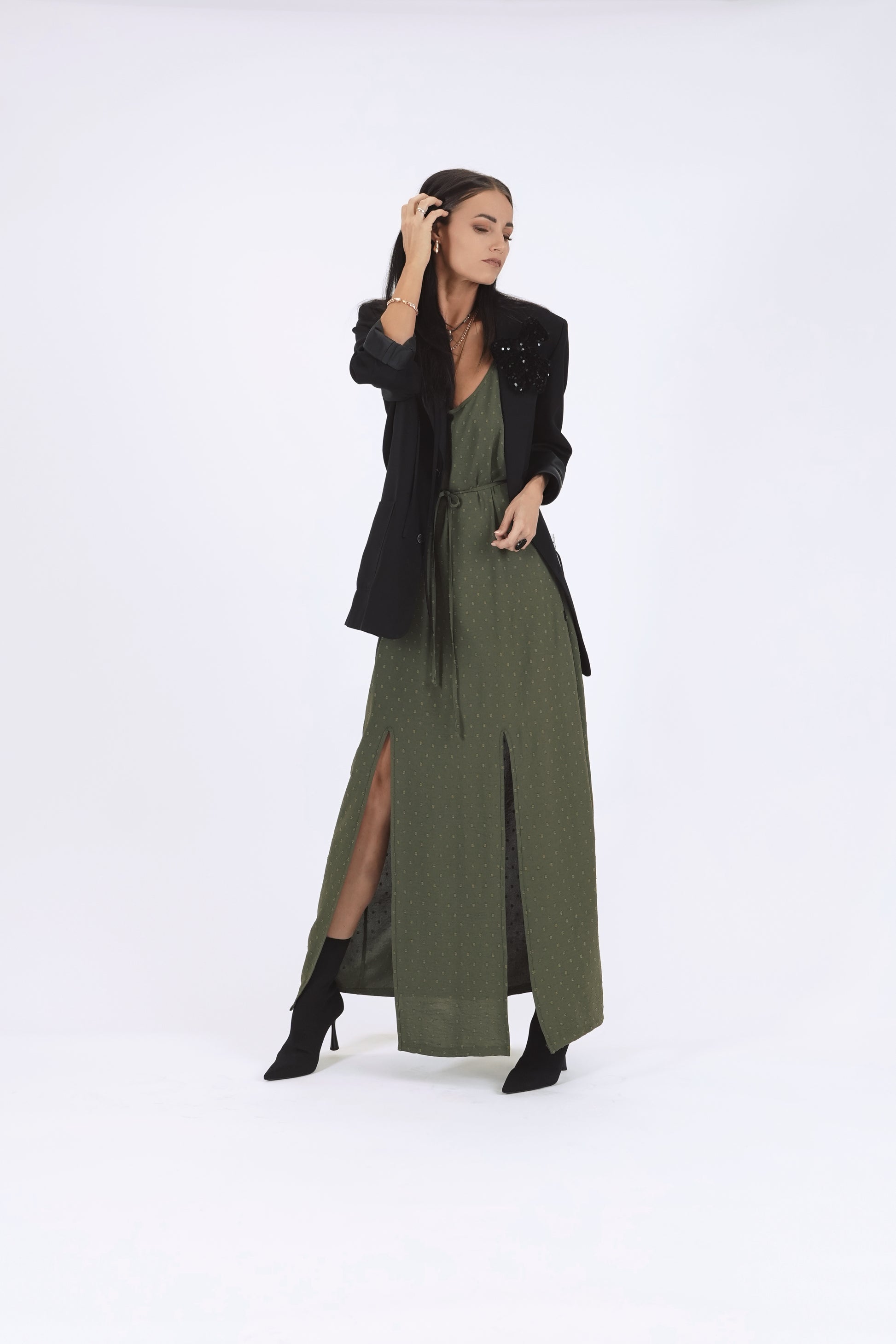 Gara kleita ar šķēlumiem, dark haki green