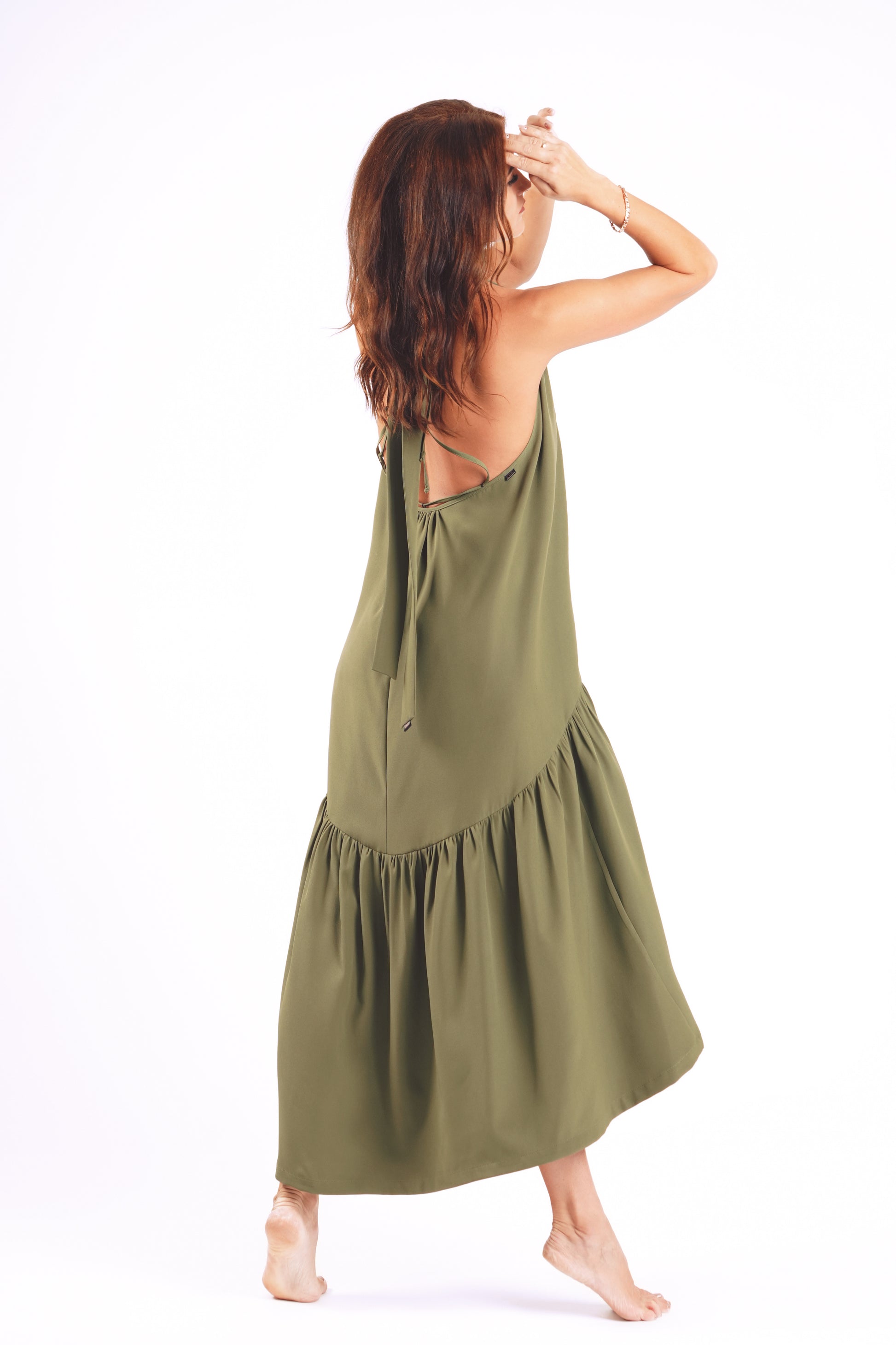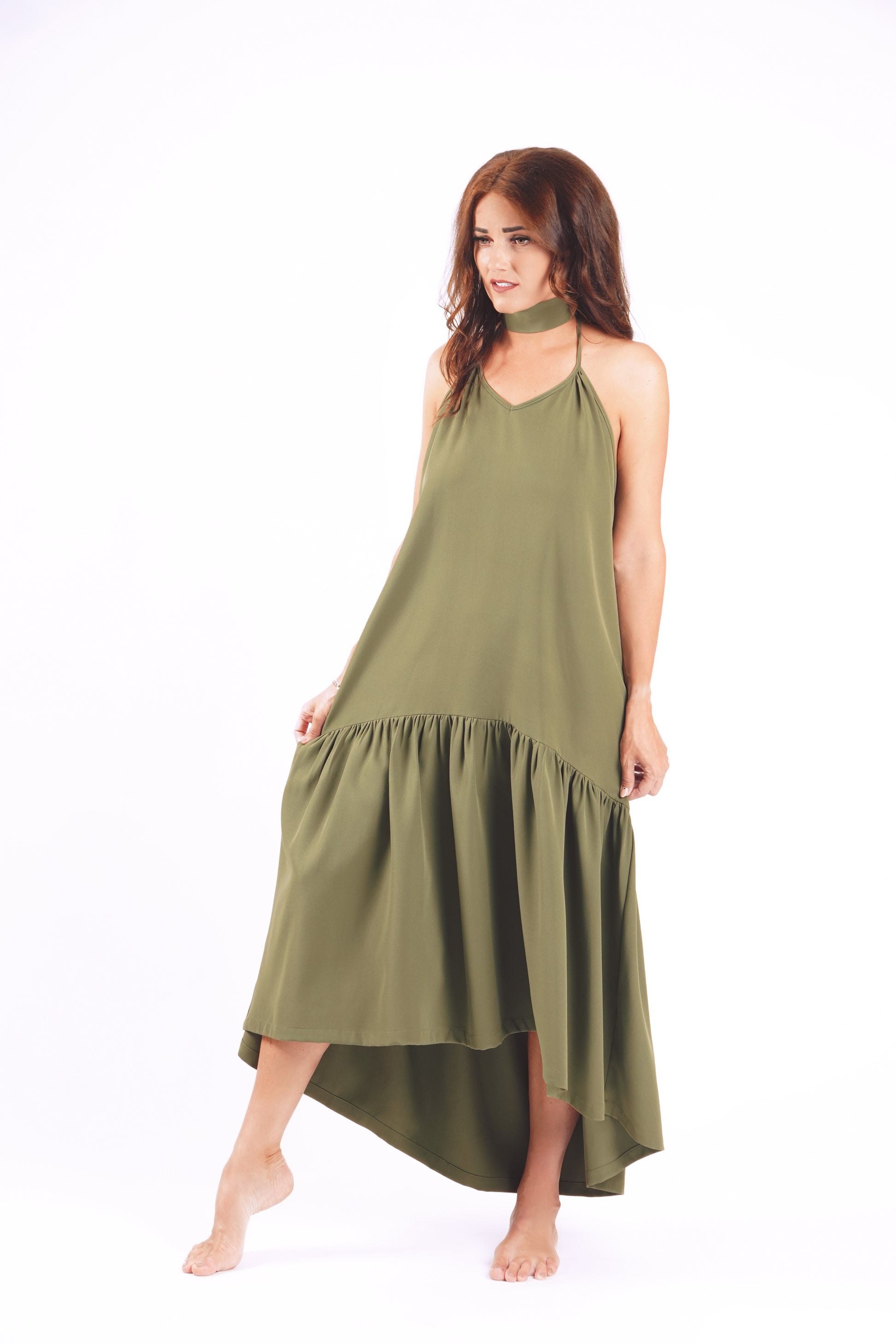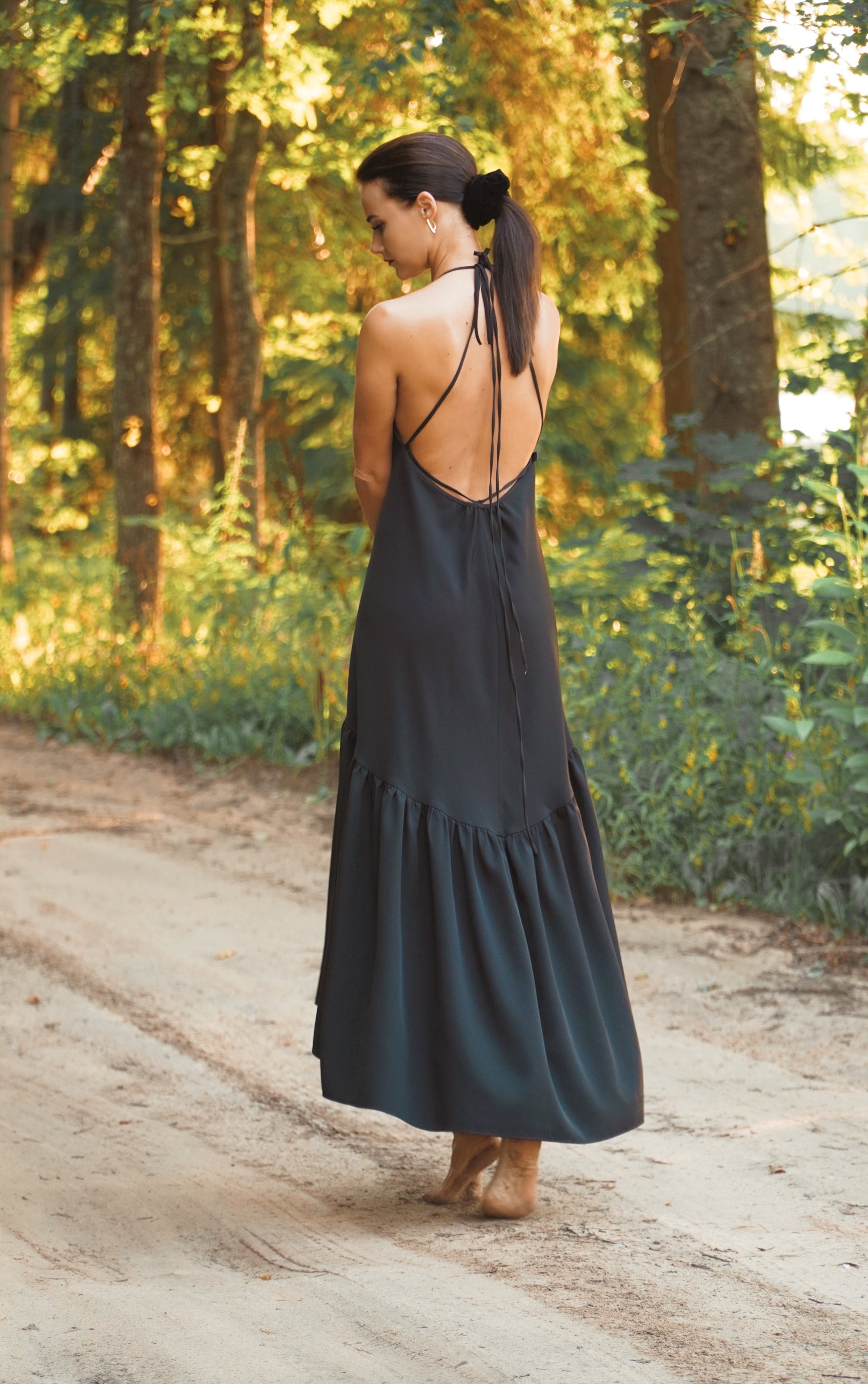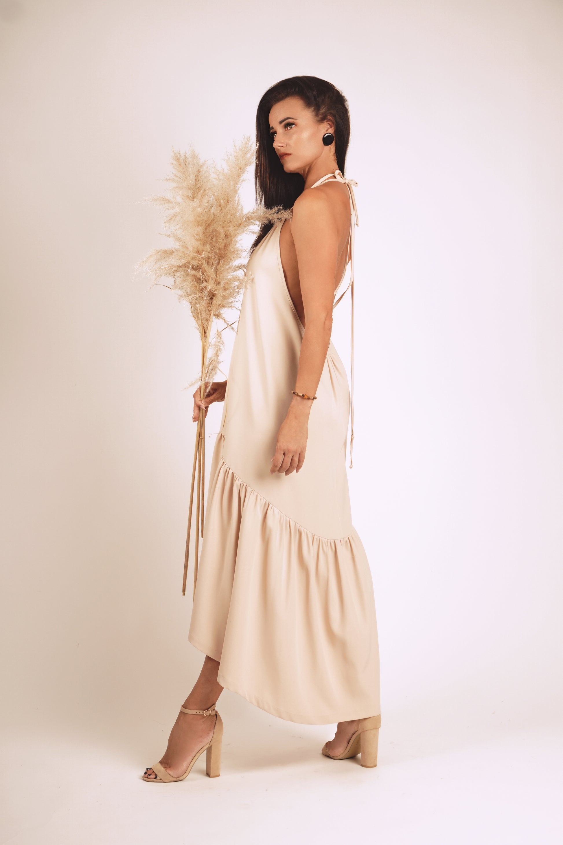 Gara volānkleita ar atsegtu muguras daļu no krāšņa un maiga auduma