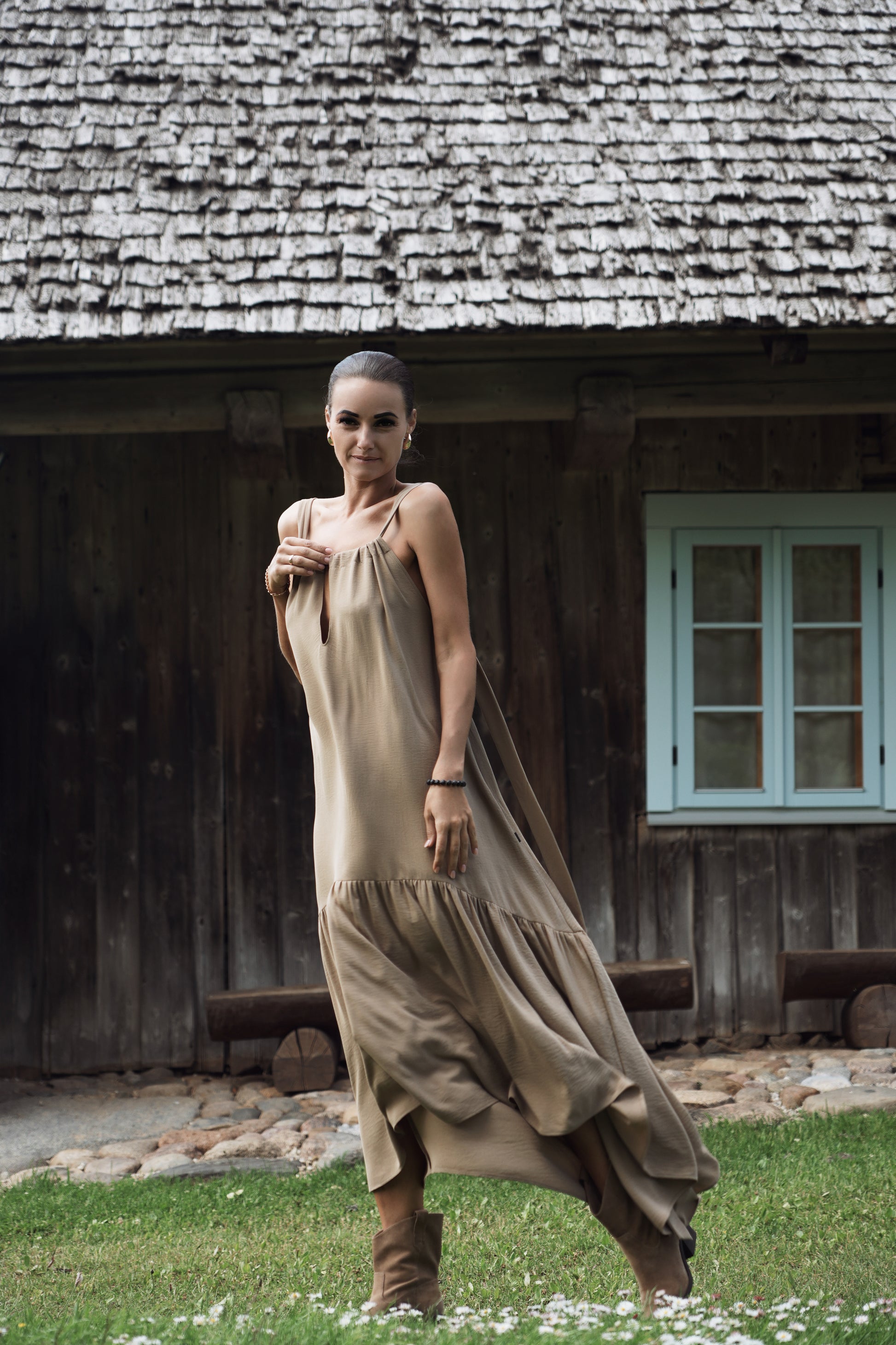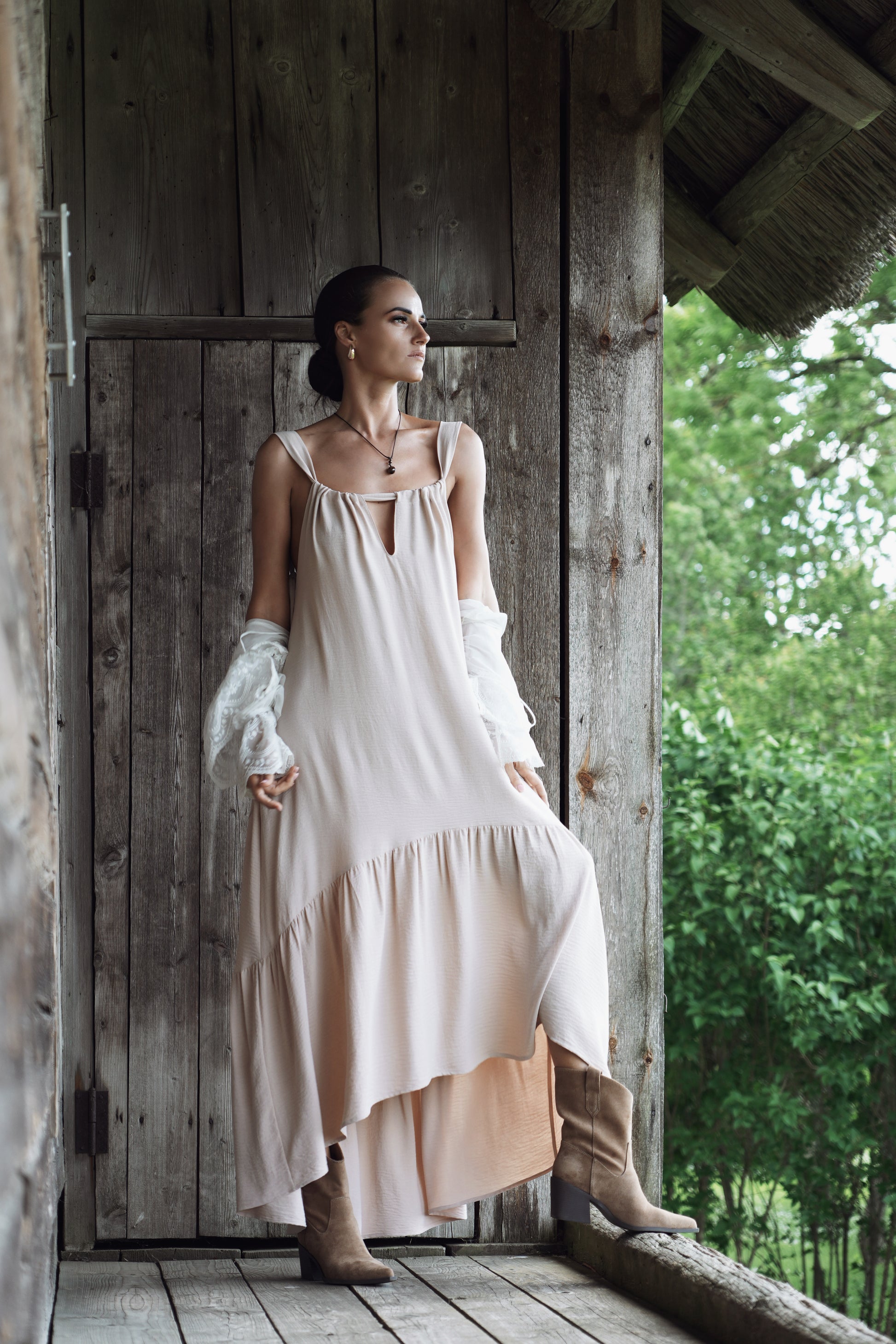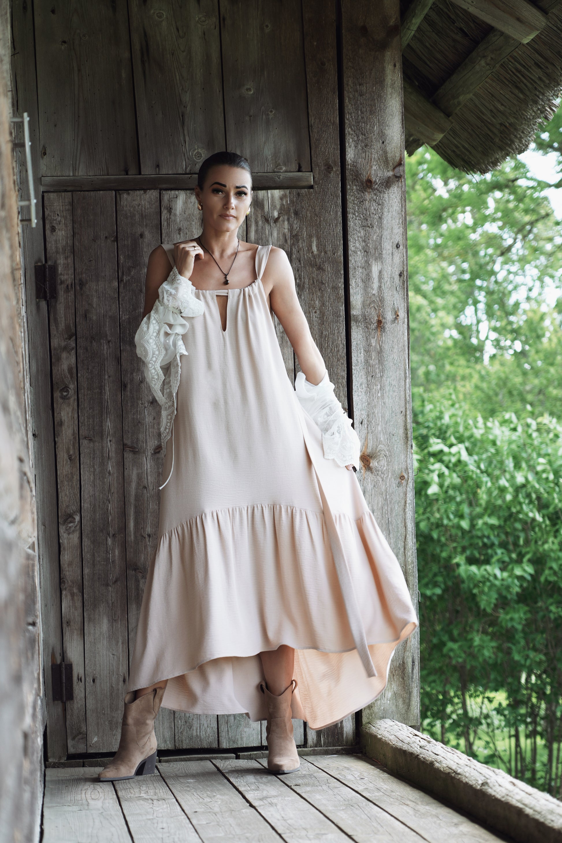 Gara volānkleita ar atsegtu muguras daļu un regulējamu dekoltē šķēlumu.
