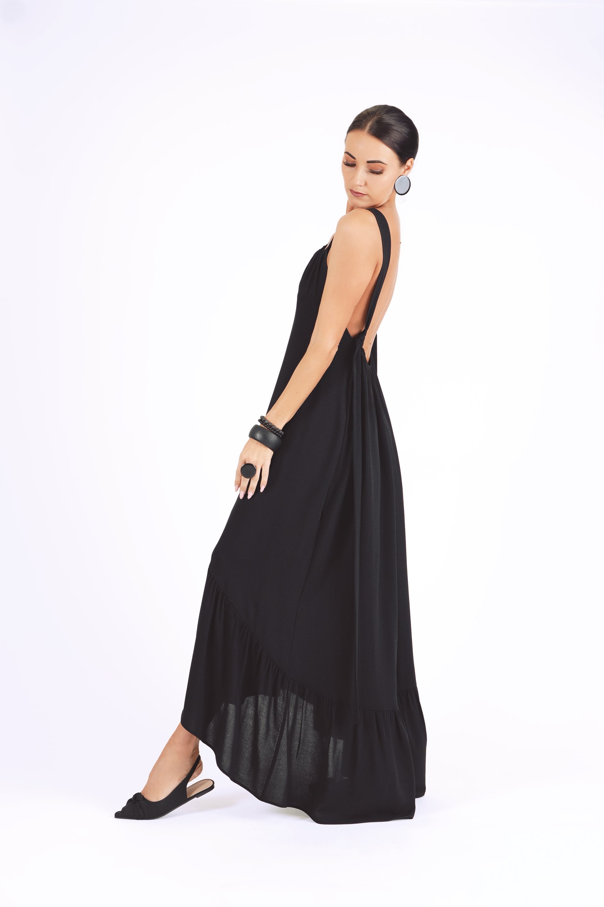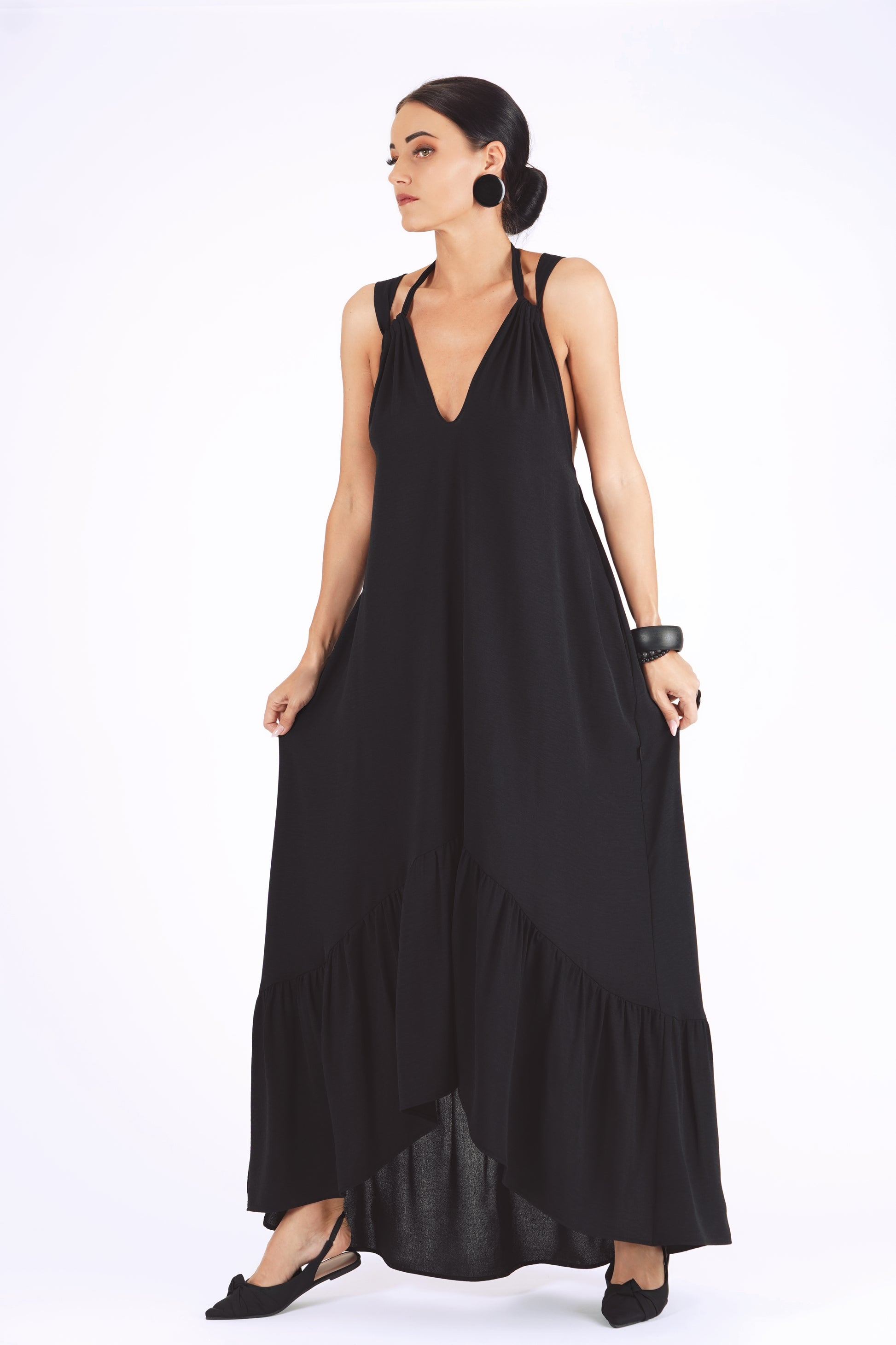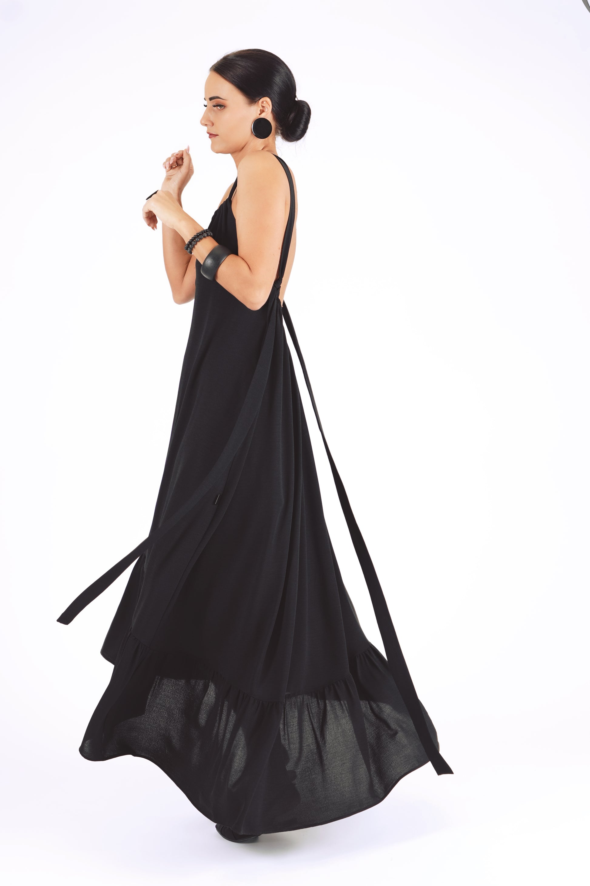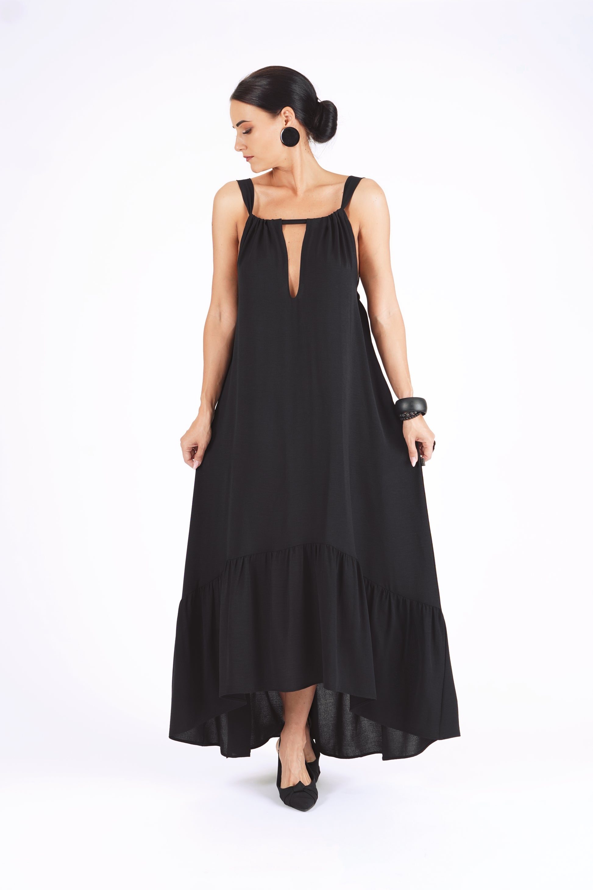 Gara volānkleita ar atsegtu muguras daļu un dekoltē šķēlumu