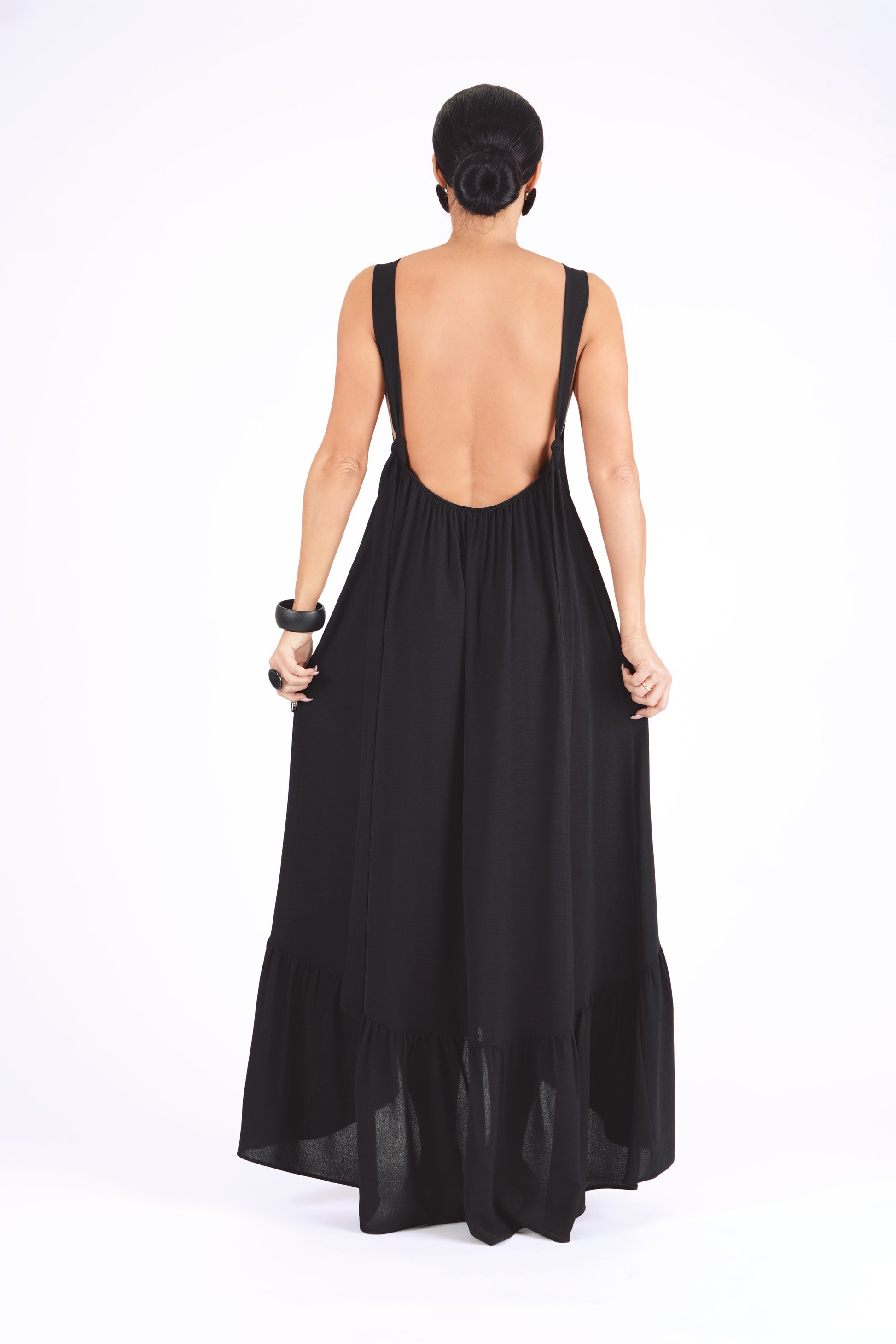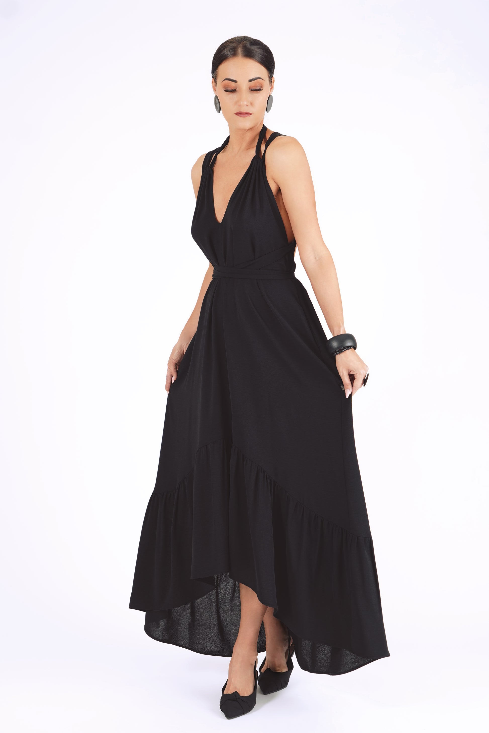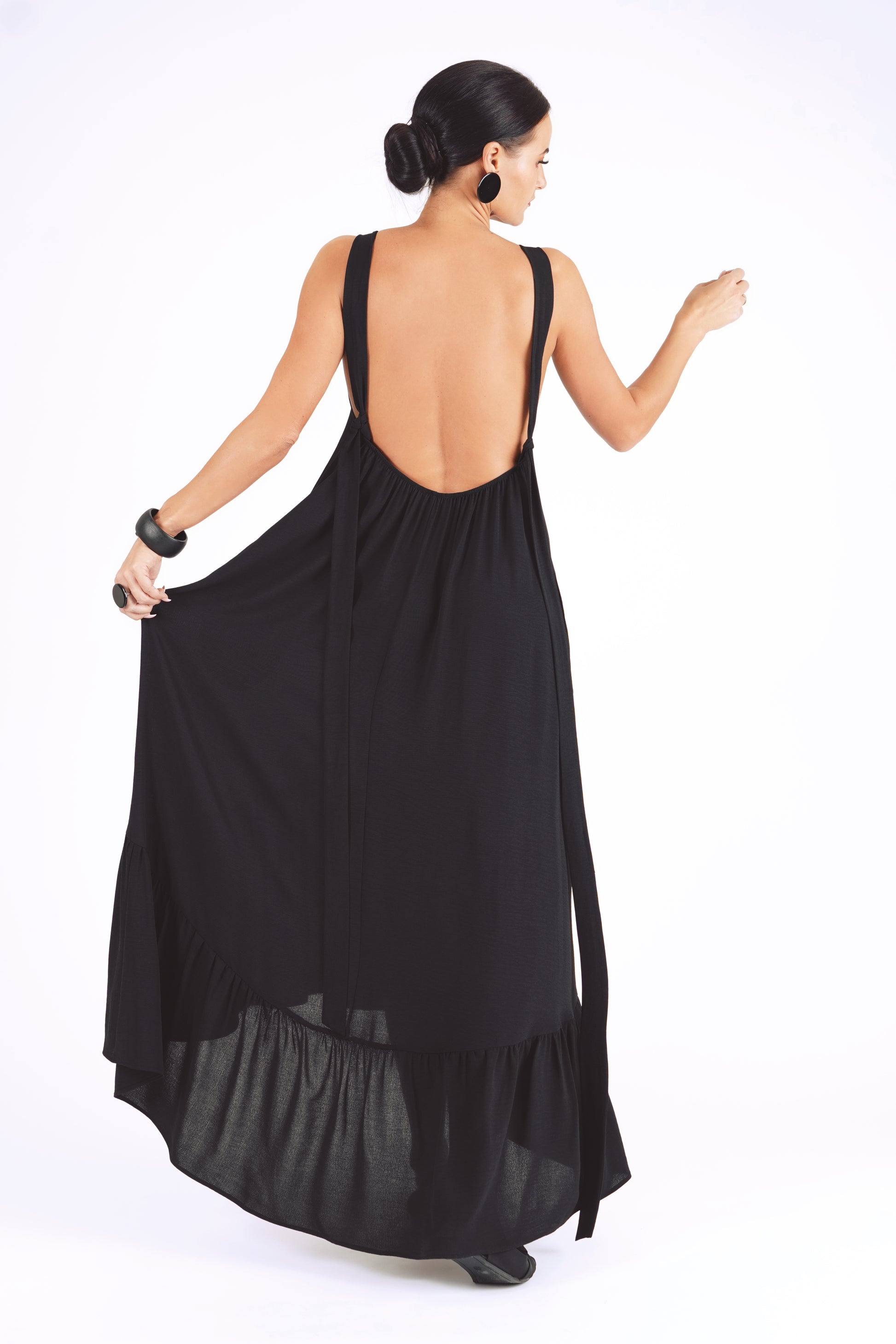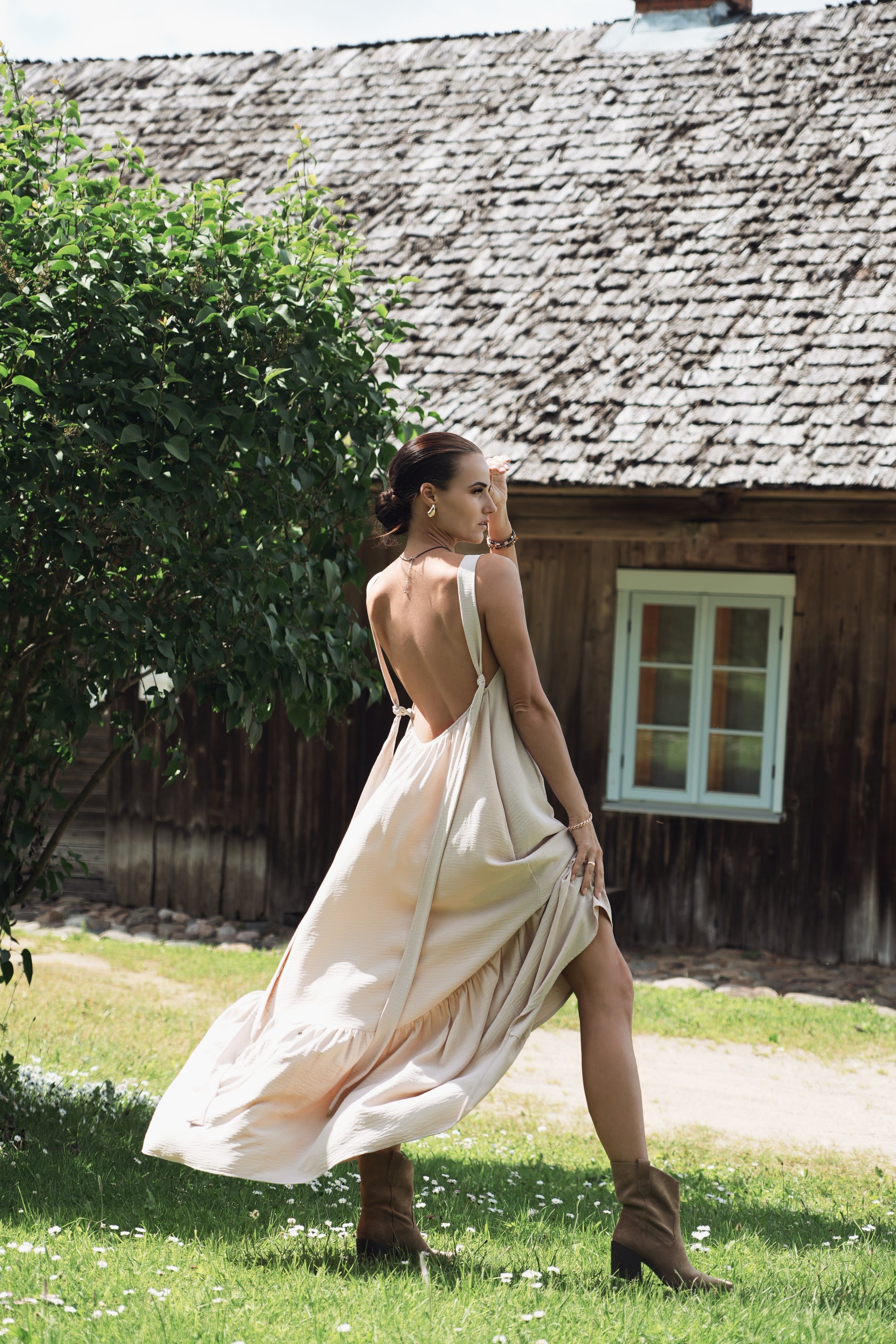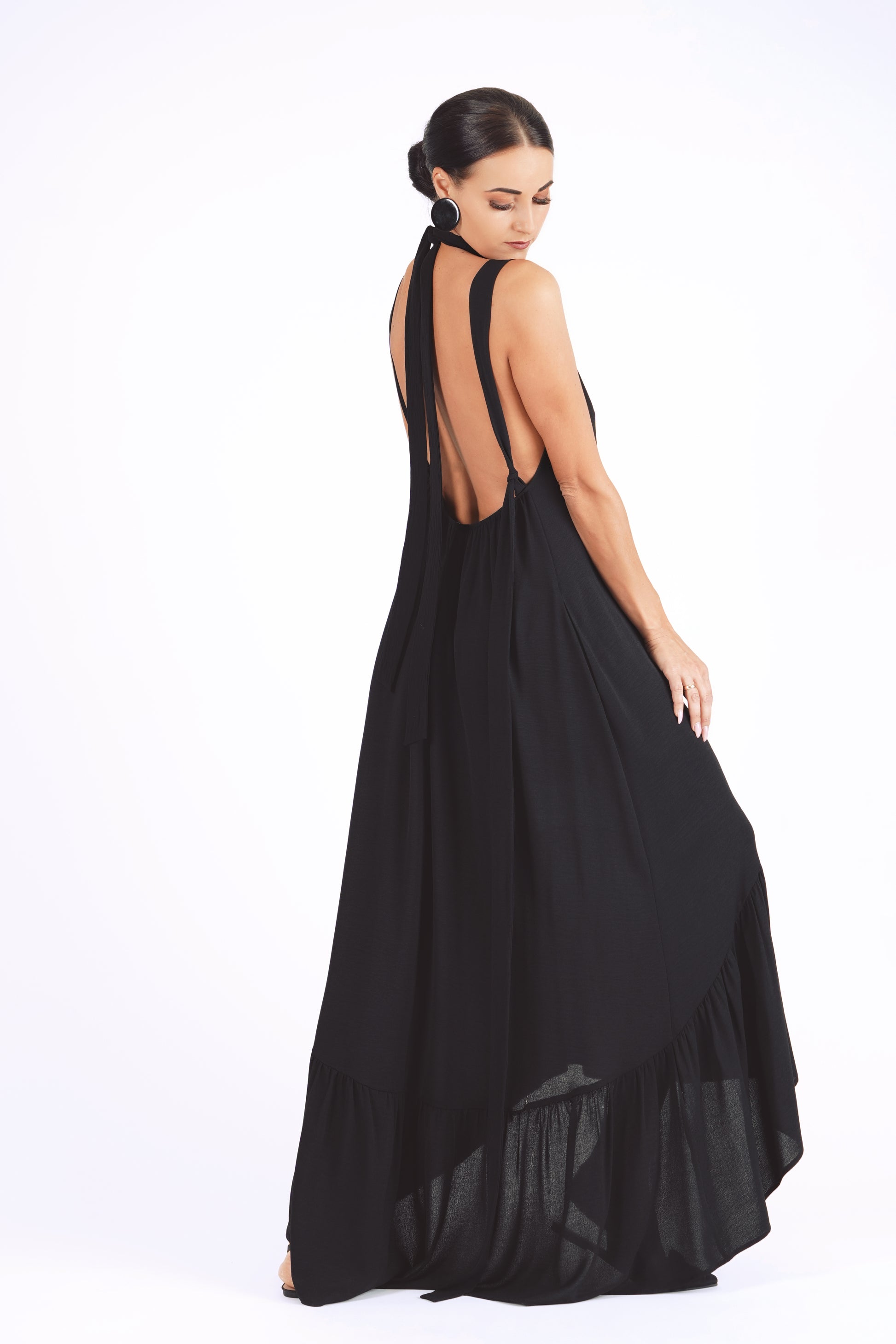 Gara volānkleita ar atsegtu muguras daļu un dekoltē šķēlumu