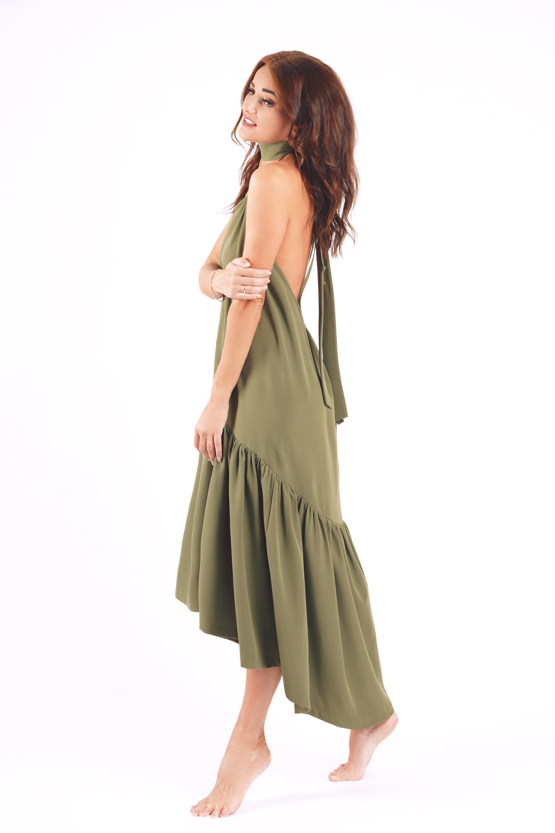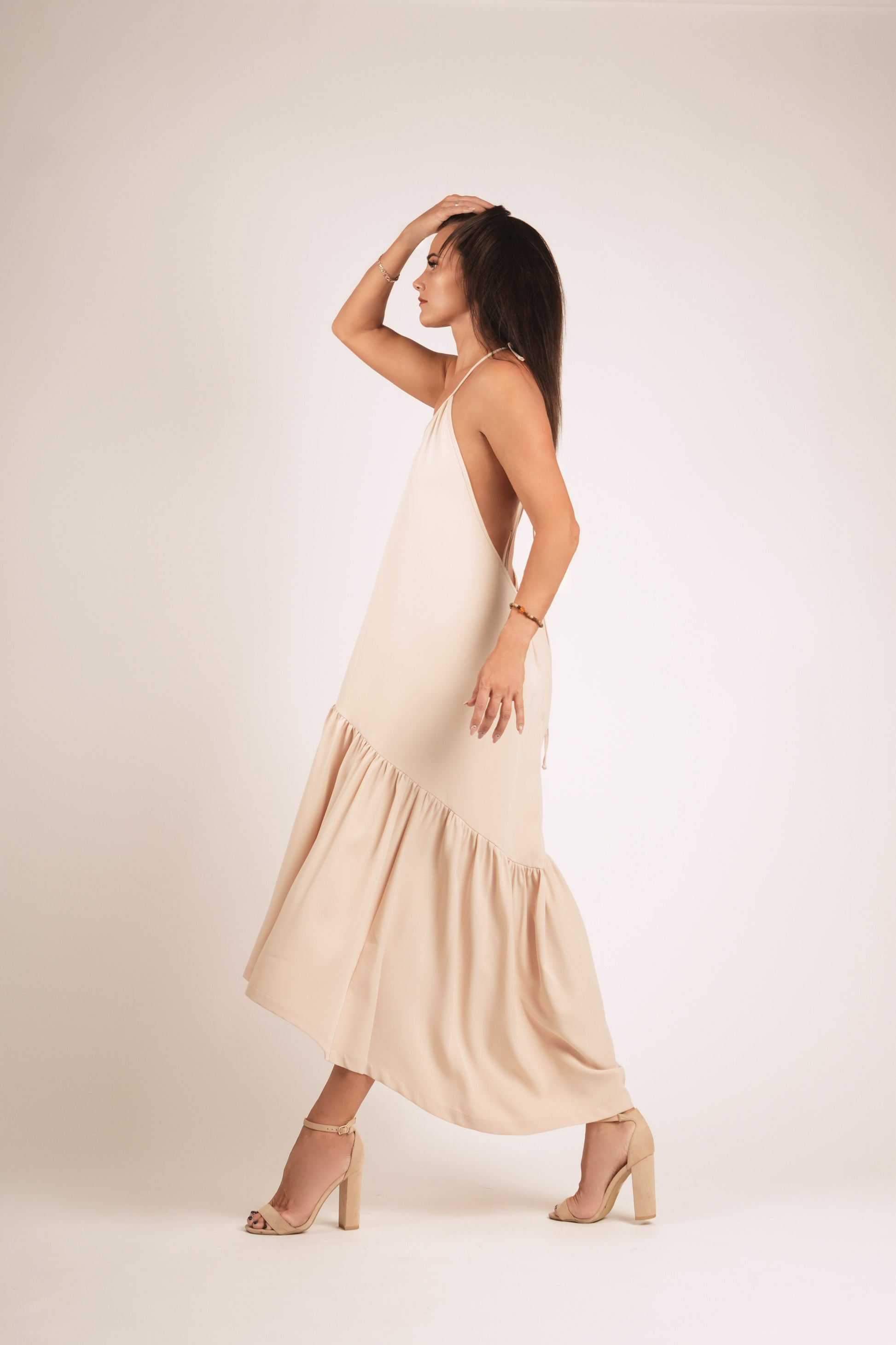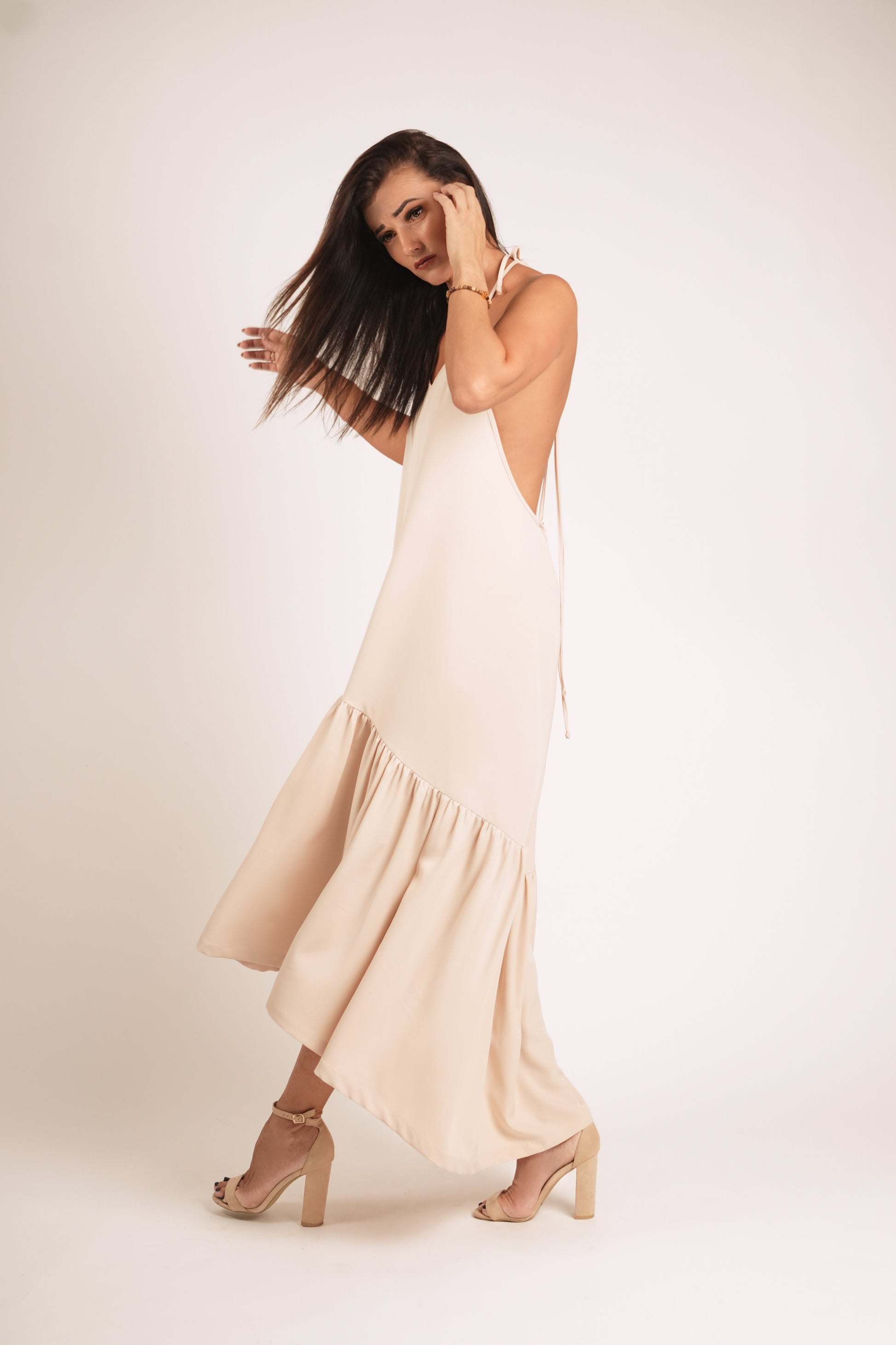Gara volānkleita ar atsegtu muguras daļu no krāšņa un maiga audums