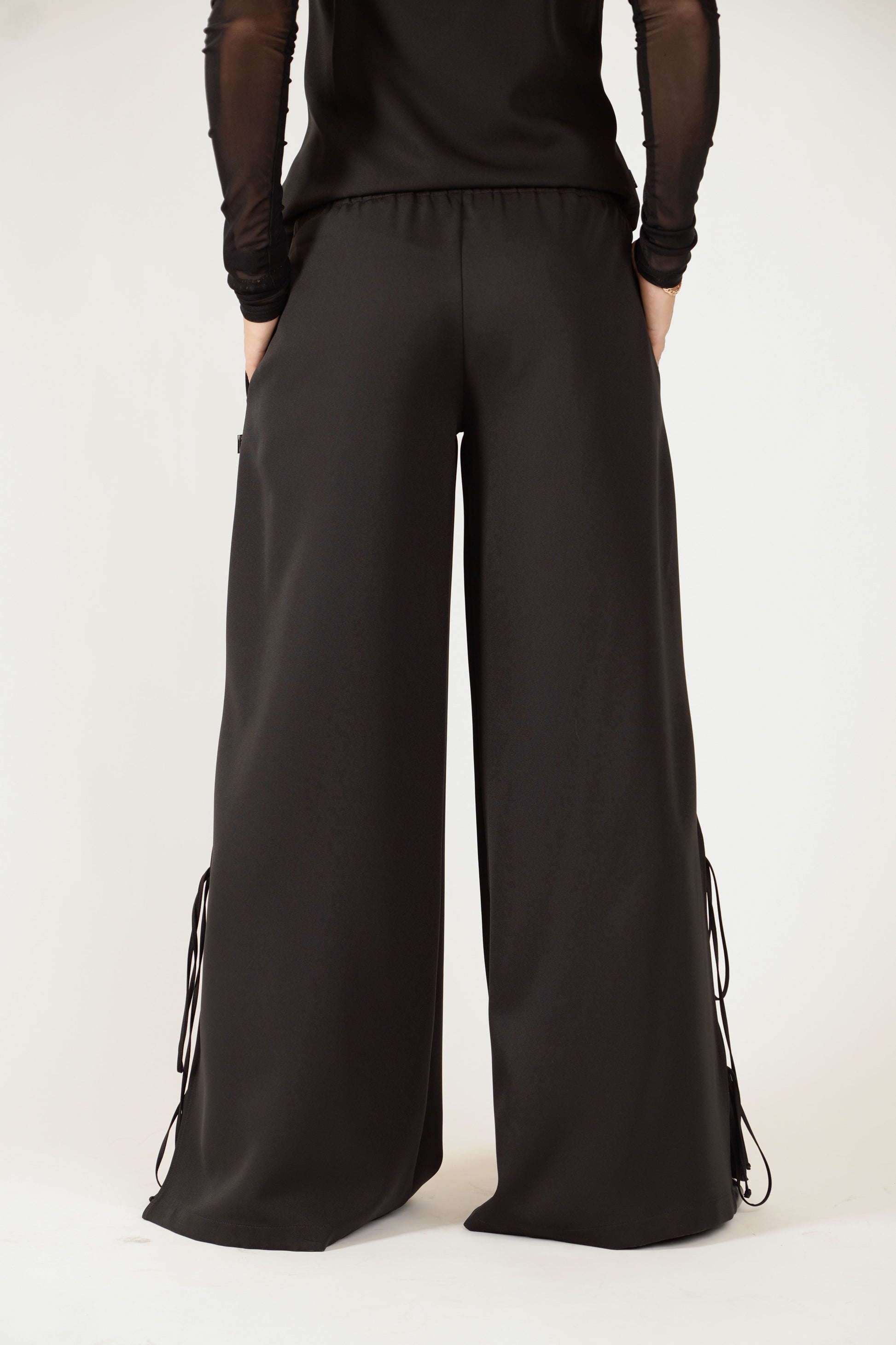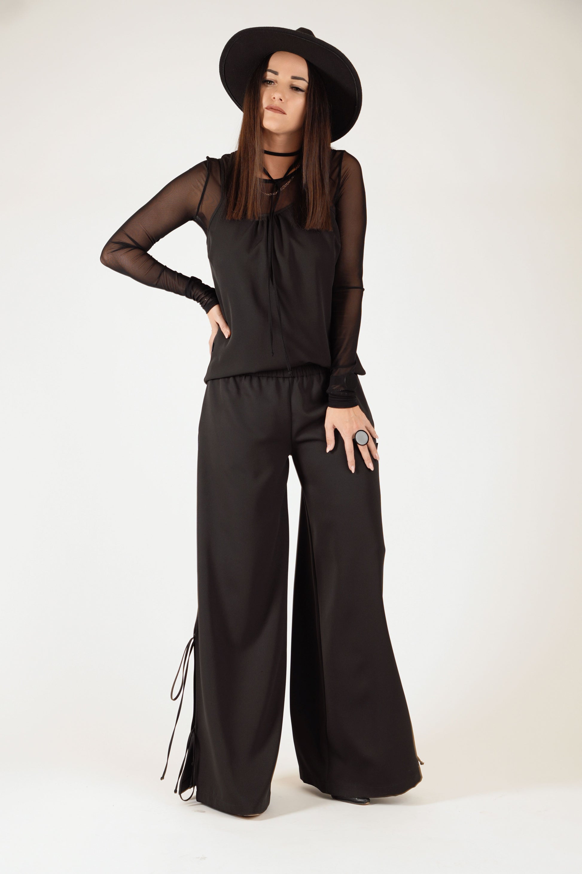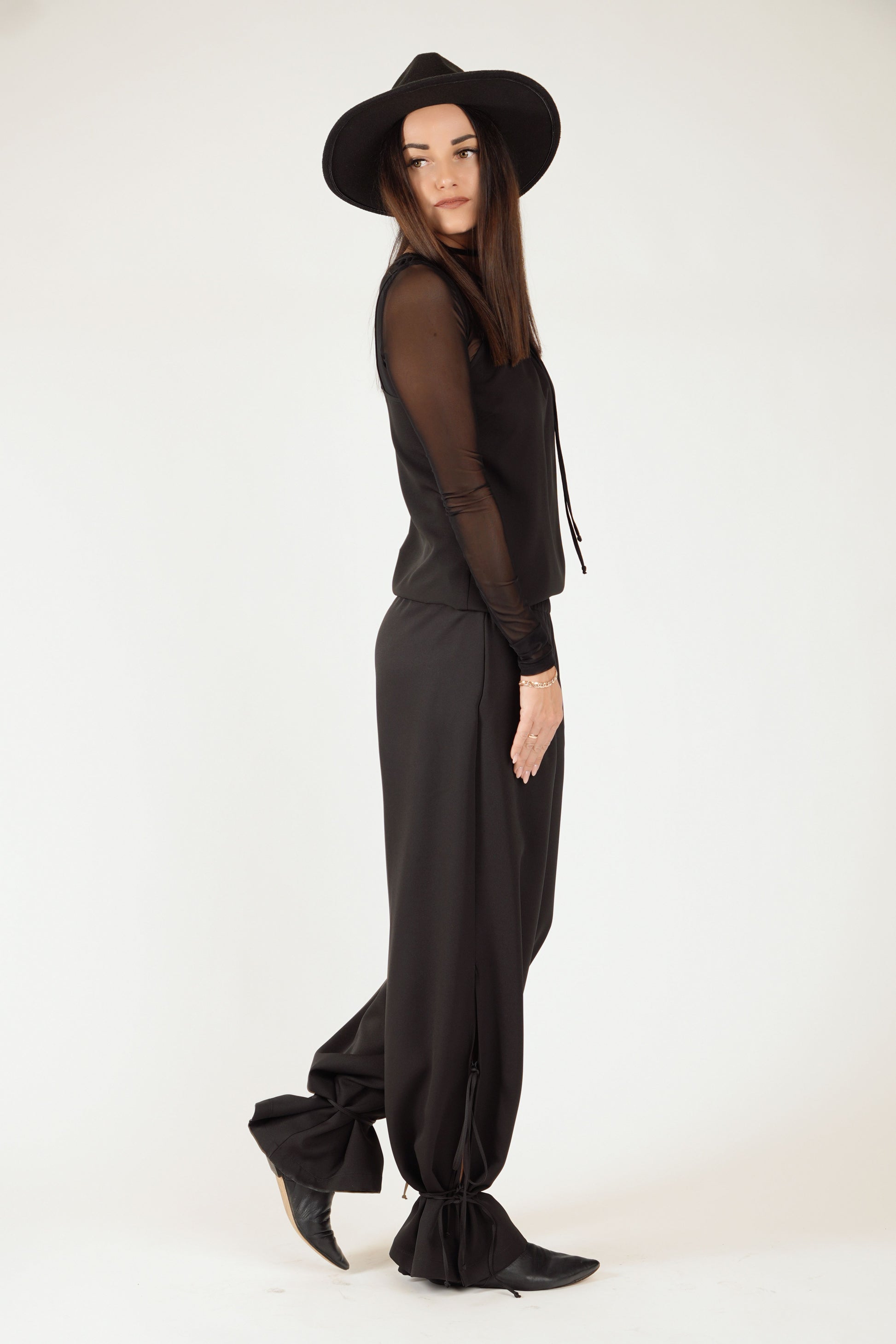 Melnas platas klasiska piegriezuma bikses ar šķēlumiem sānos, gumijas jostasvietu un sānu vīles kabatām. Šķēluma dziļums - līdz ceļgalam. Šķēluma aizdare - divos agstumos sasienama auduma lenta. Lentas iespējams noņemt un nēsāt pilnībā atvērtu šķēlumu. Kā arī, apakšējo lentu iespējams sasiet ap potīti, radot "aladina" tipa bikses.