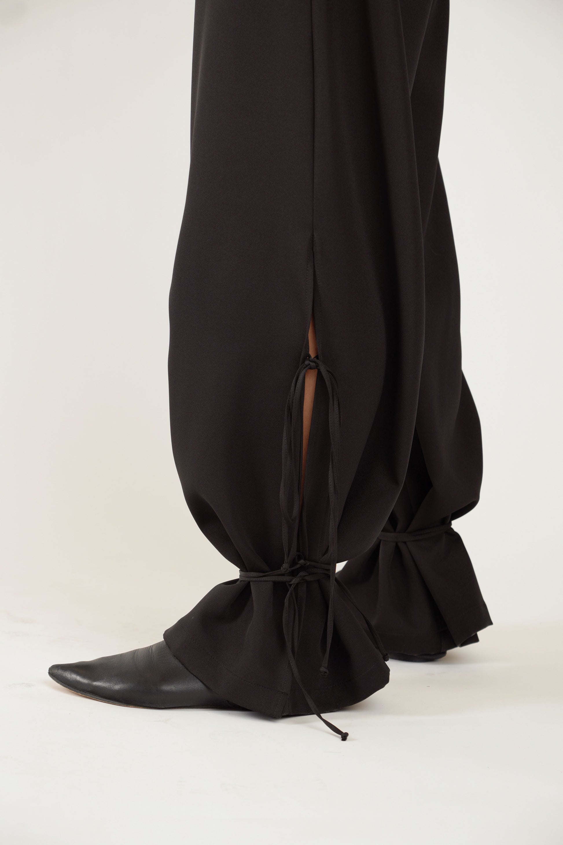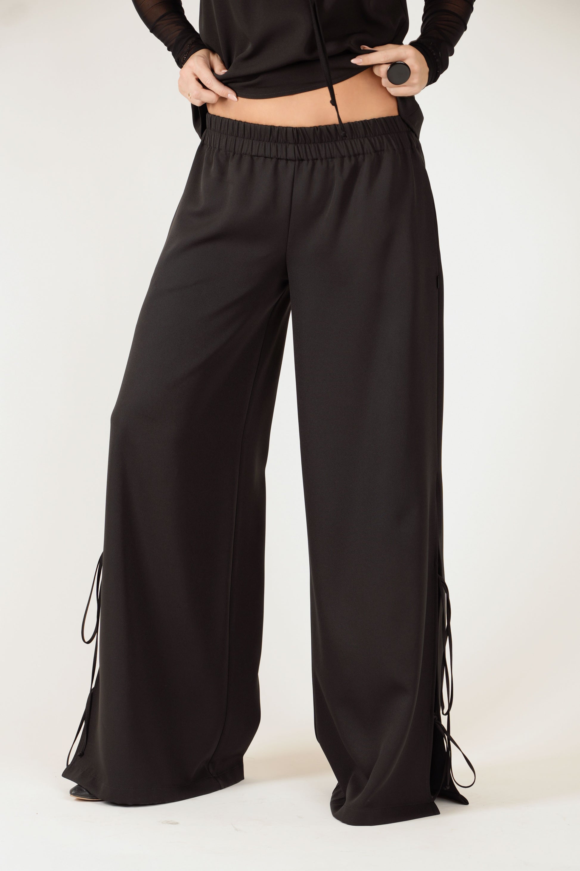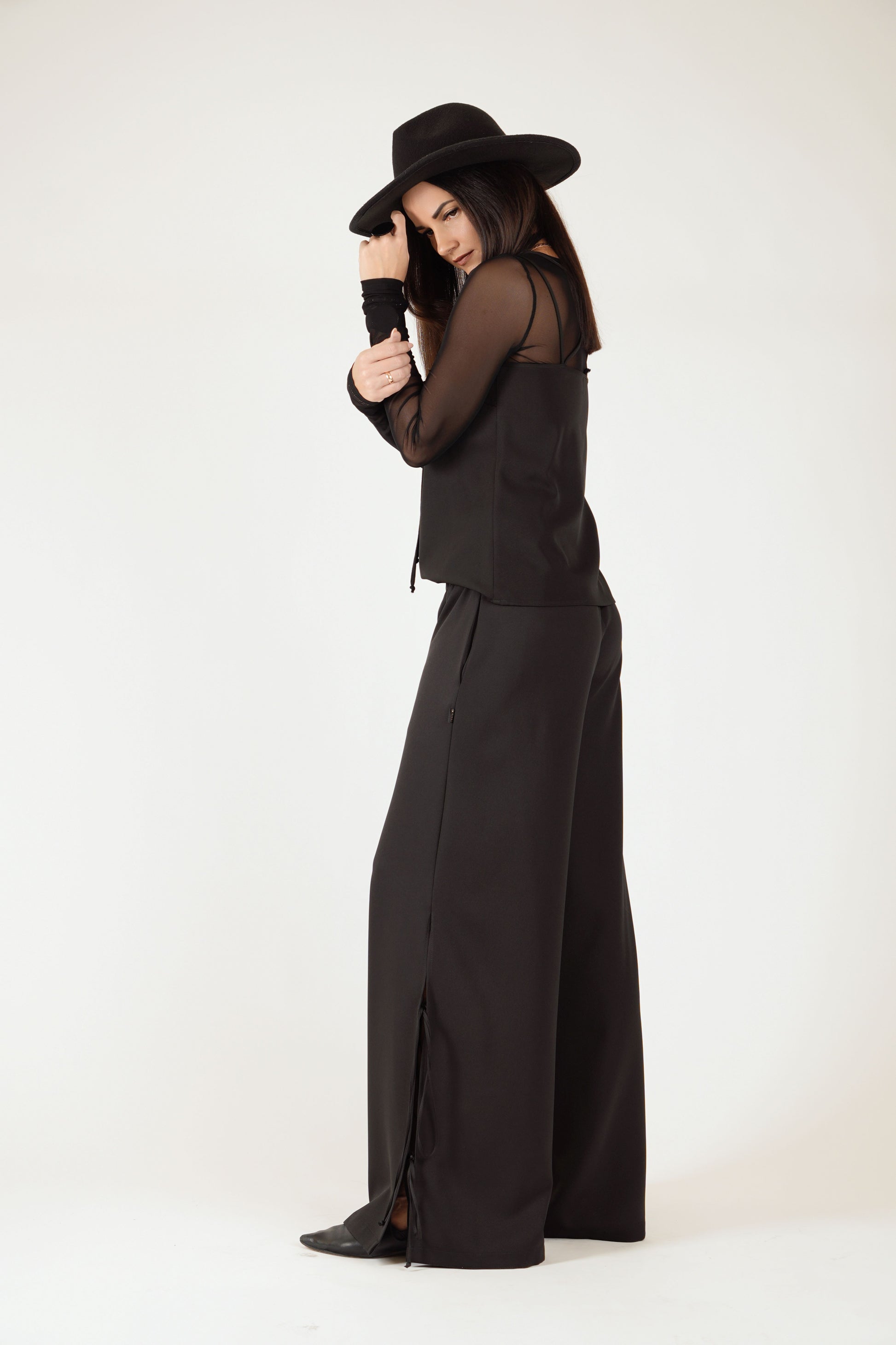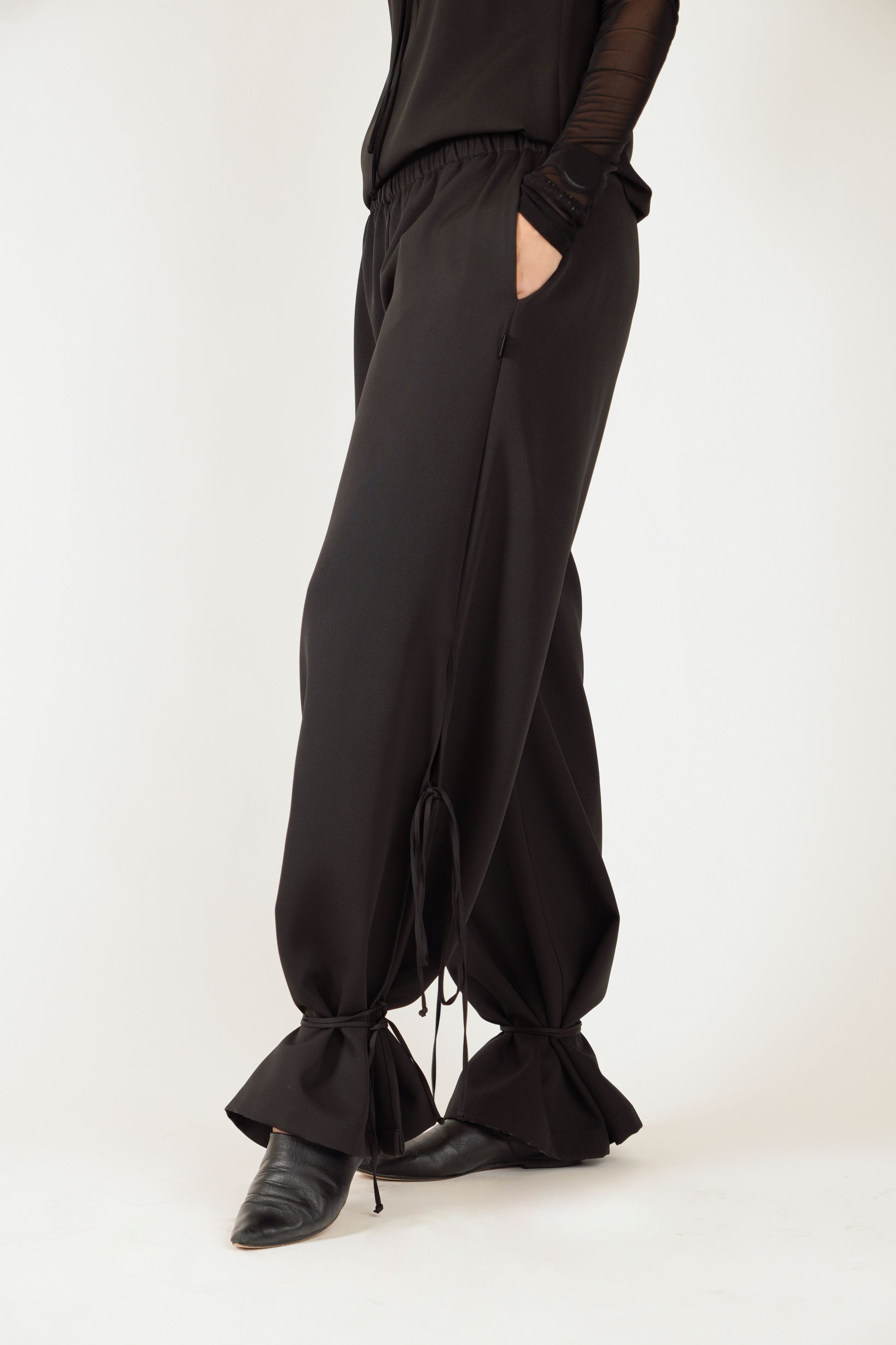 Melnas platas klasiska piegriezuma bikses ar šķēlumiem sānos, gumijas jostasvietu un sānu vīles kabatām. Šķēluma dziļums - līdz ceļgalam. Šķēluma aizdare - divos agstumos sasienama auduma lenta. Lentas iespējams noņemt un nēsāt pilnībā atvērtu šķēlumu. Kā arī, apakšējo lentu iespējams sasiet ap potīti, radot "aladina" tipa bikses.