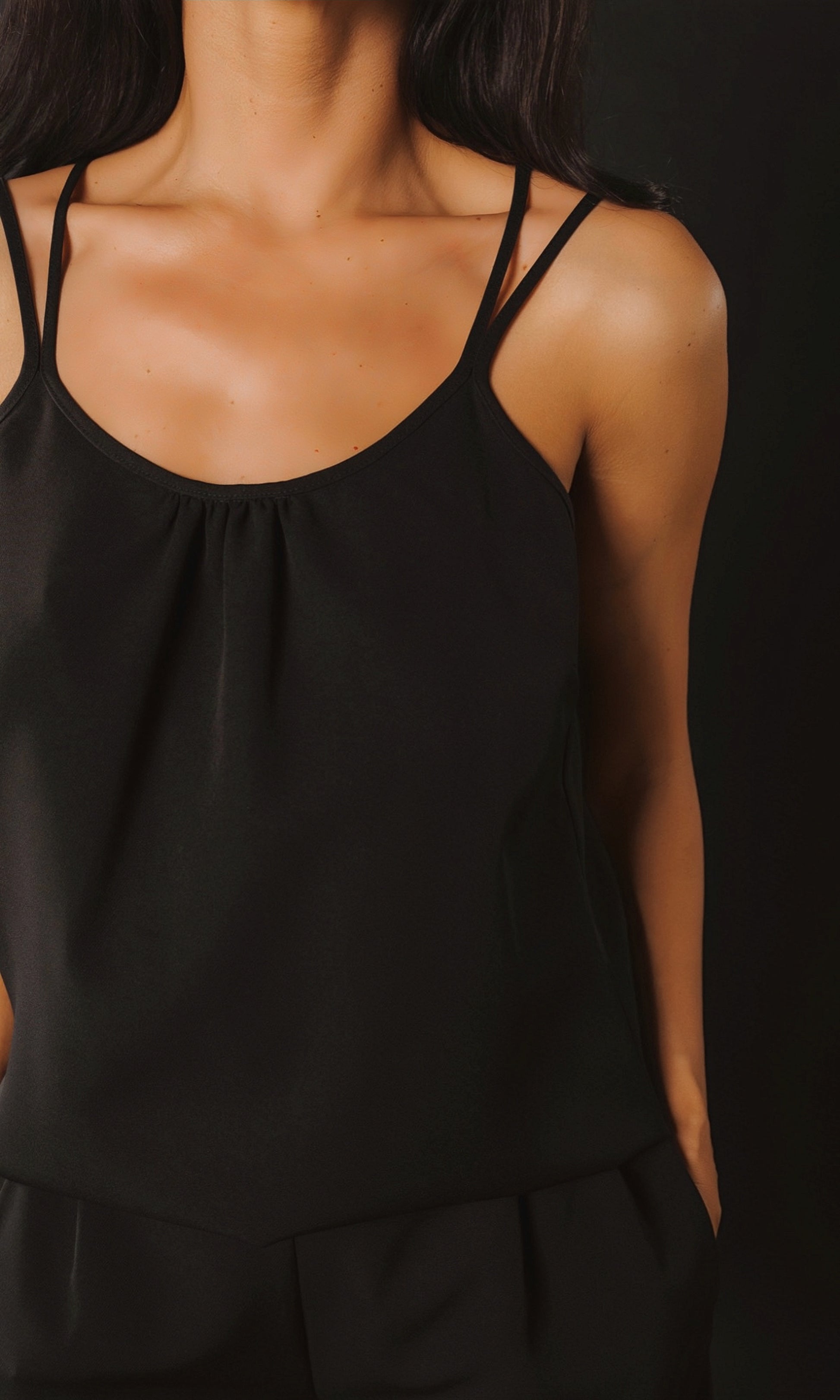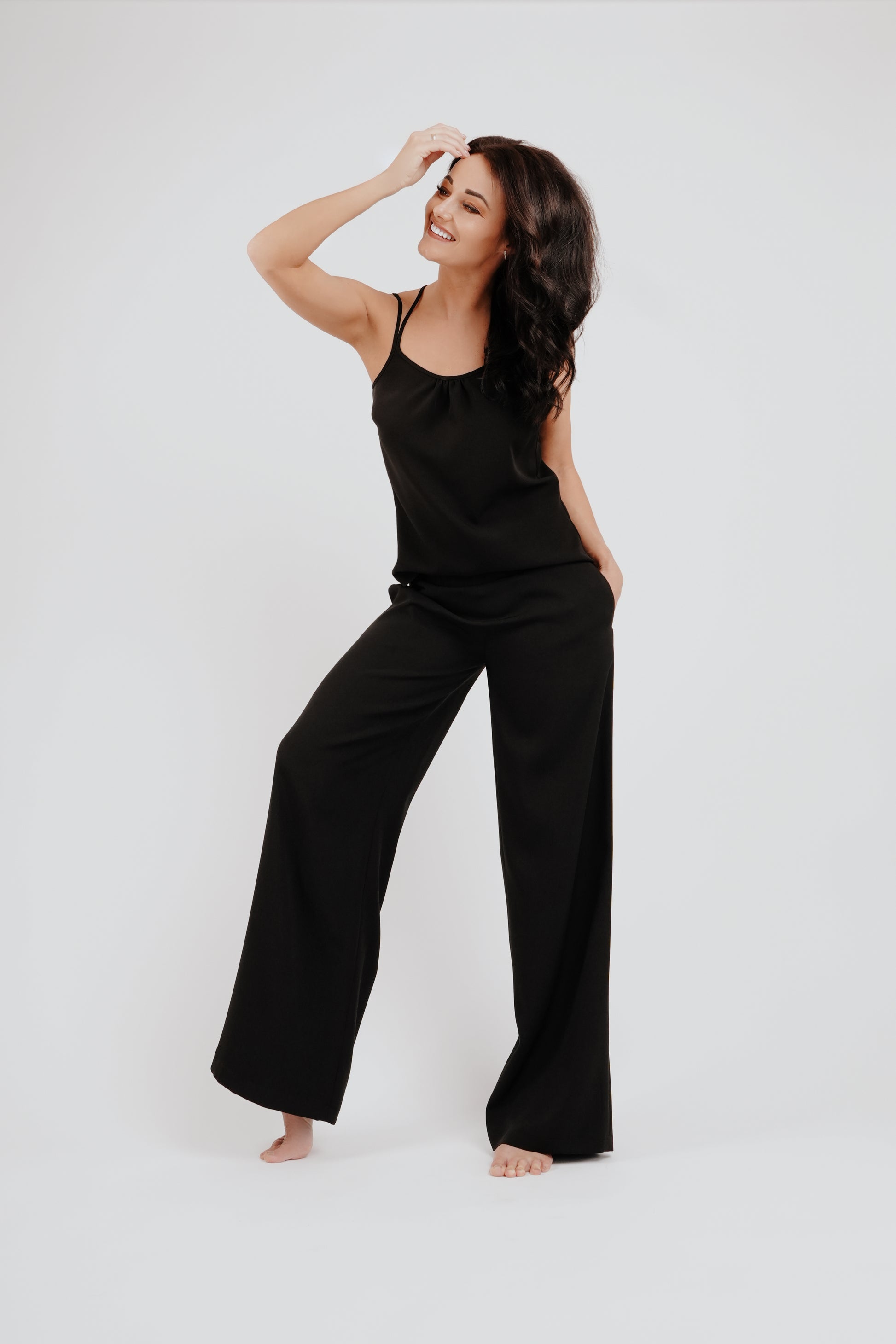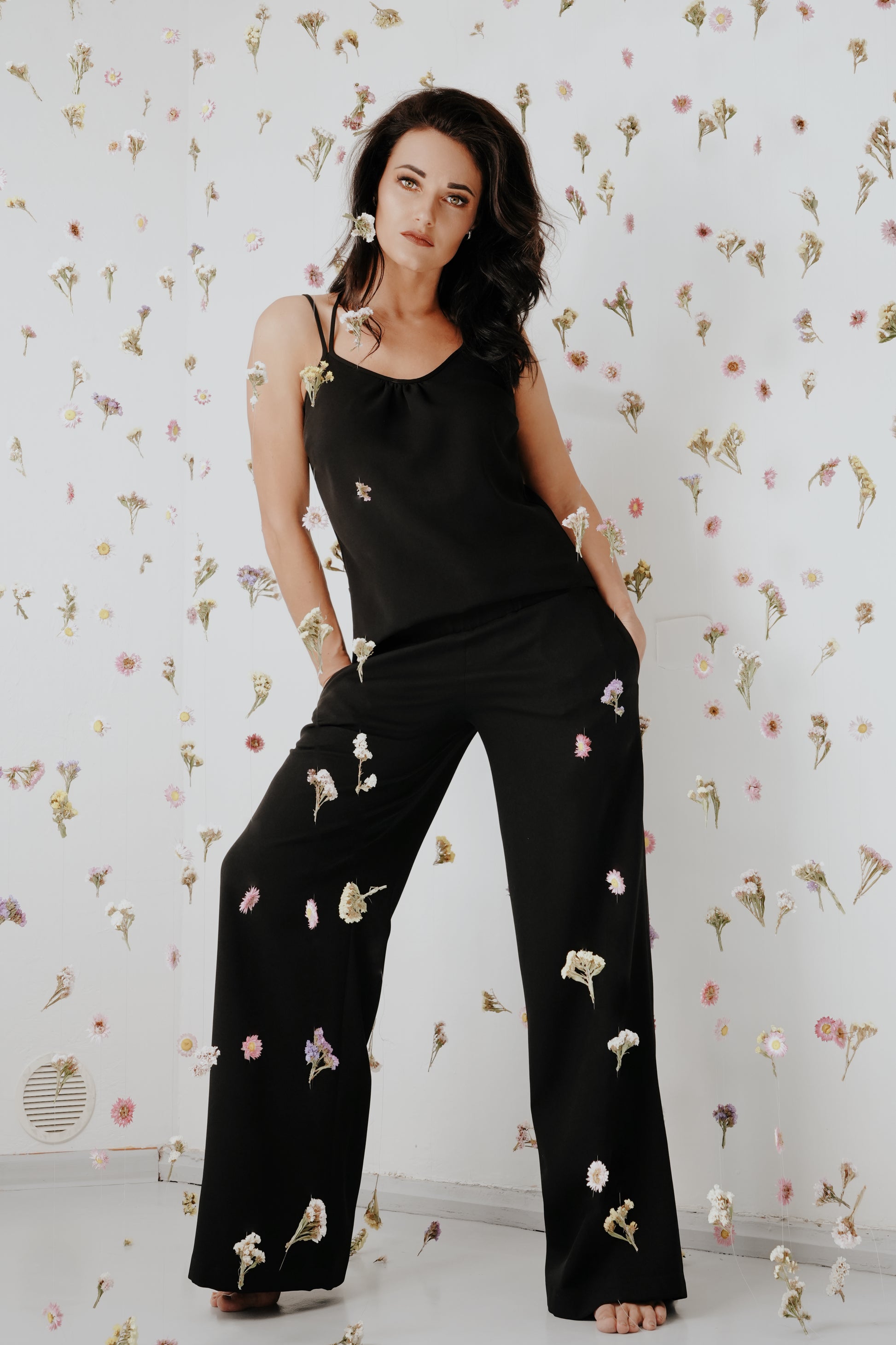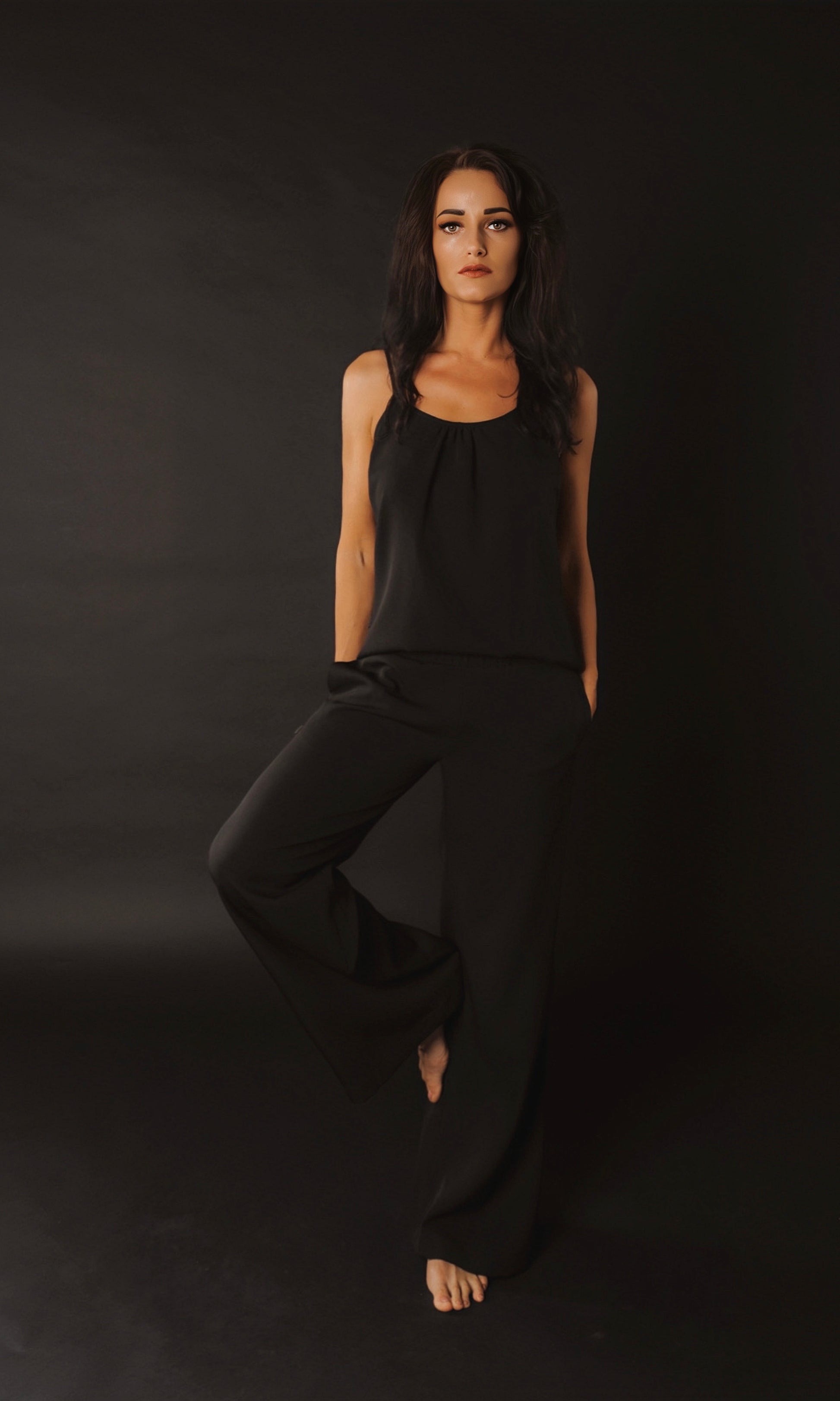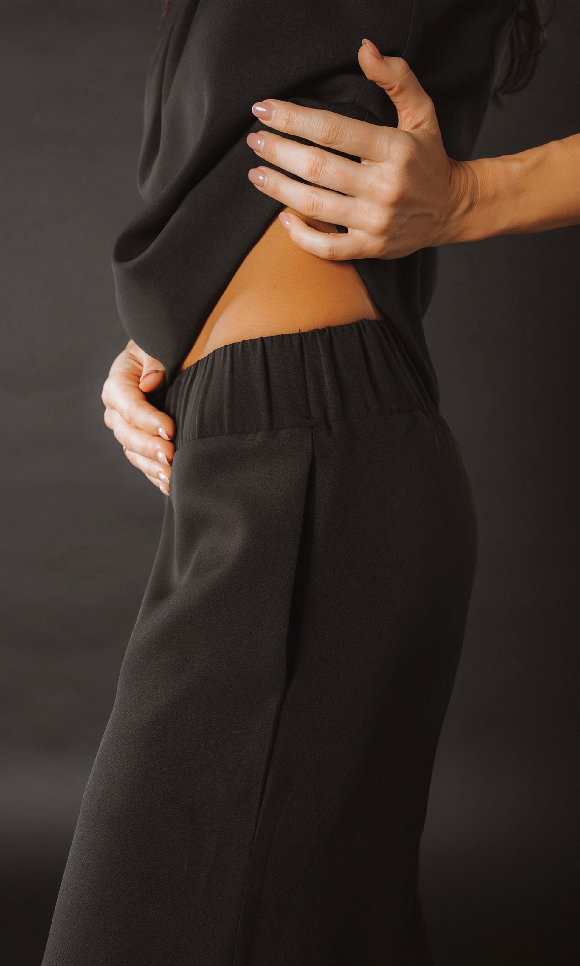 Klasiskas bikses ar sānu kabatām un melns tops ar dubultajām lencēm krāšņa un maiga auduma