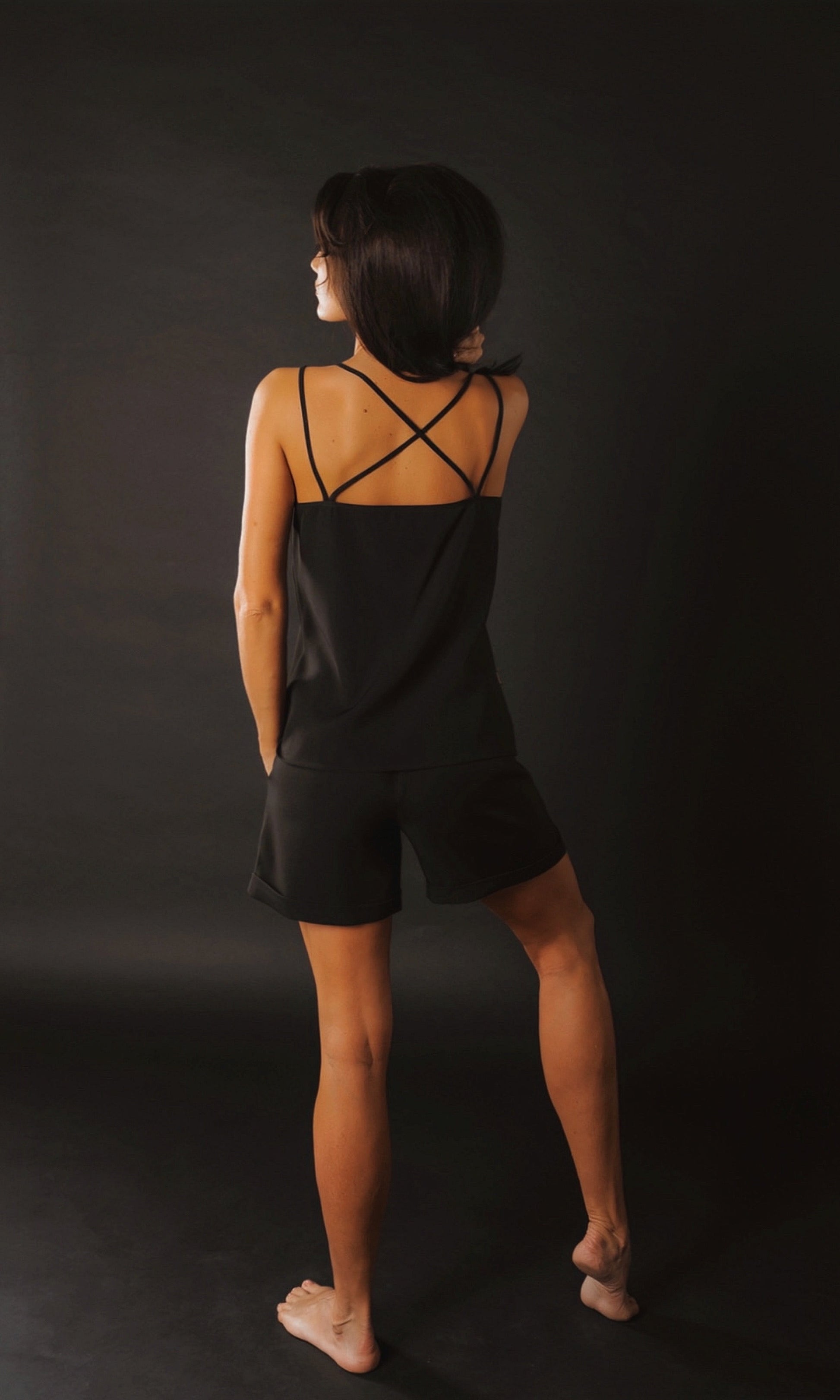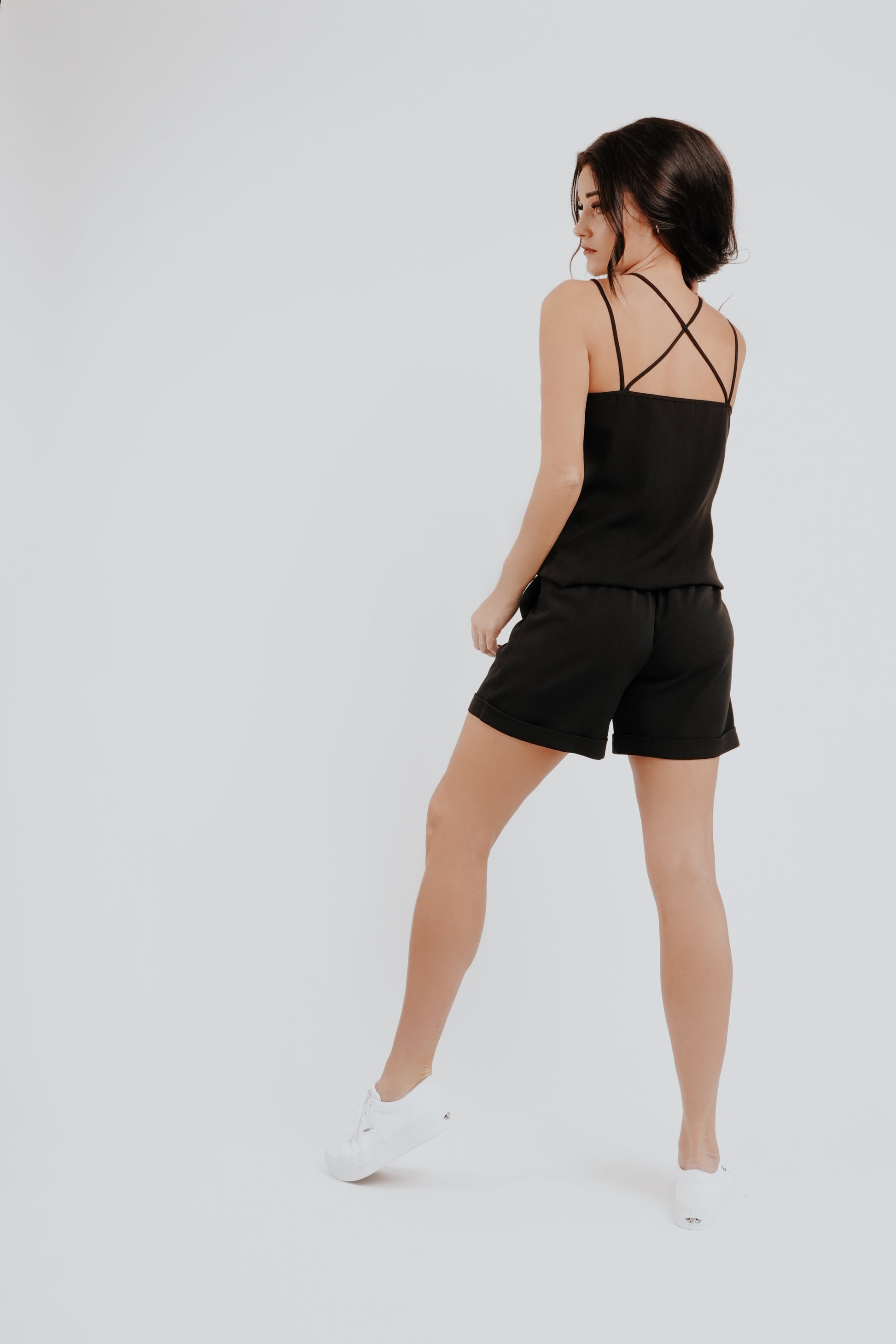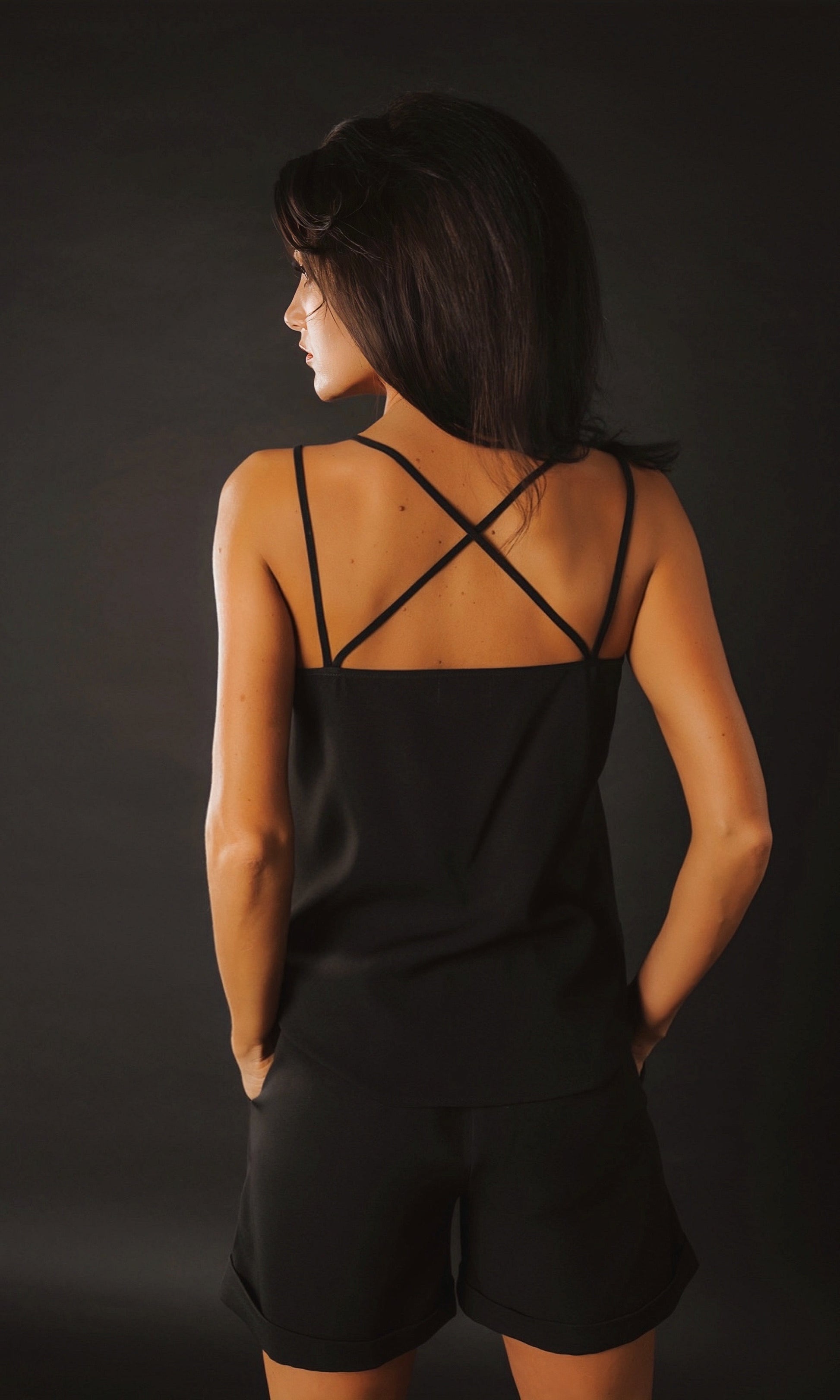 Komplekts - klasiski šorti ar augsto jostu, sānu kabatām un atlokiem un melns tops ar dubultajām lencēm no krāšņa un maiga auduma.