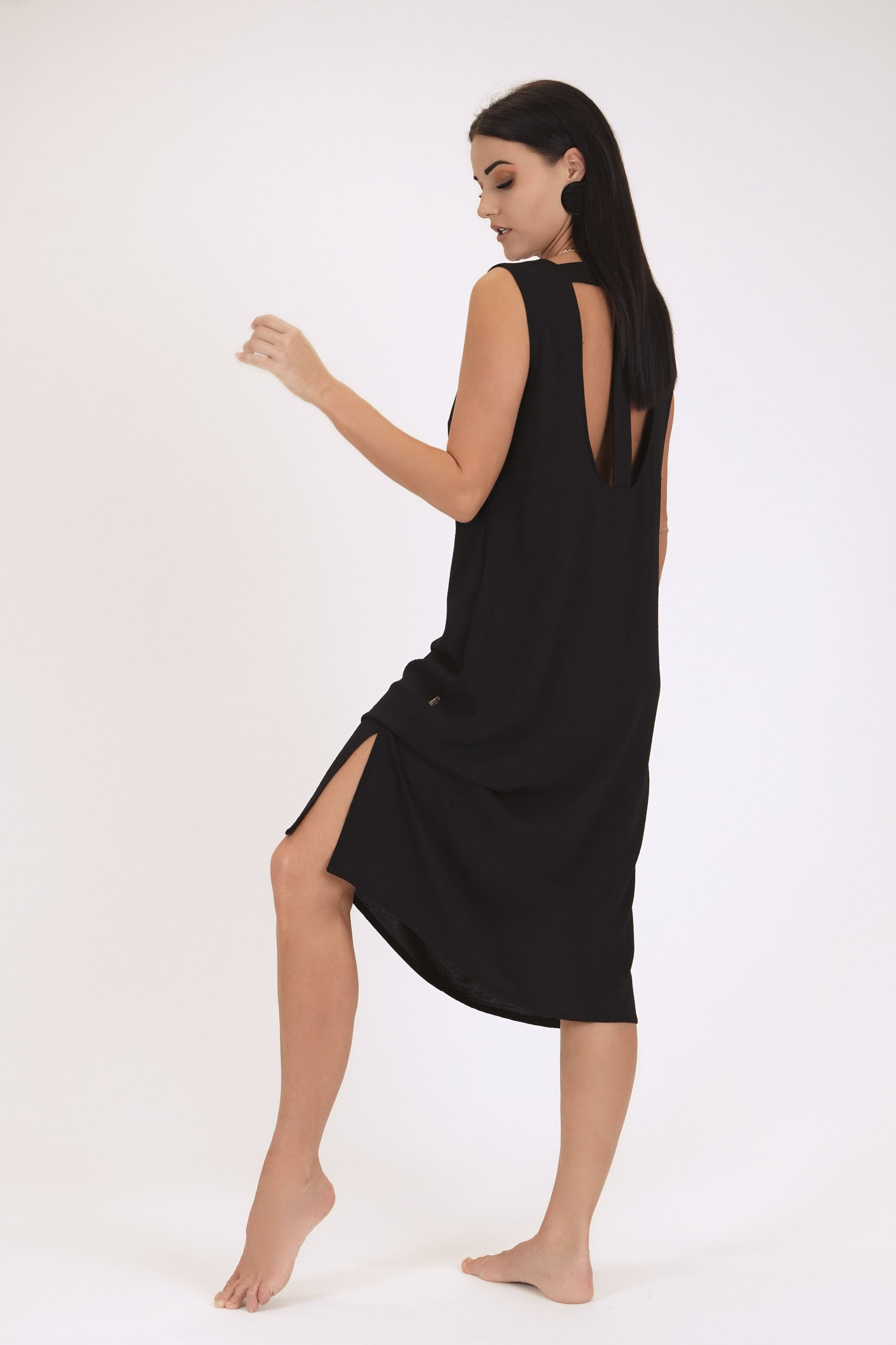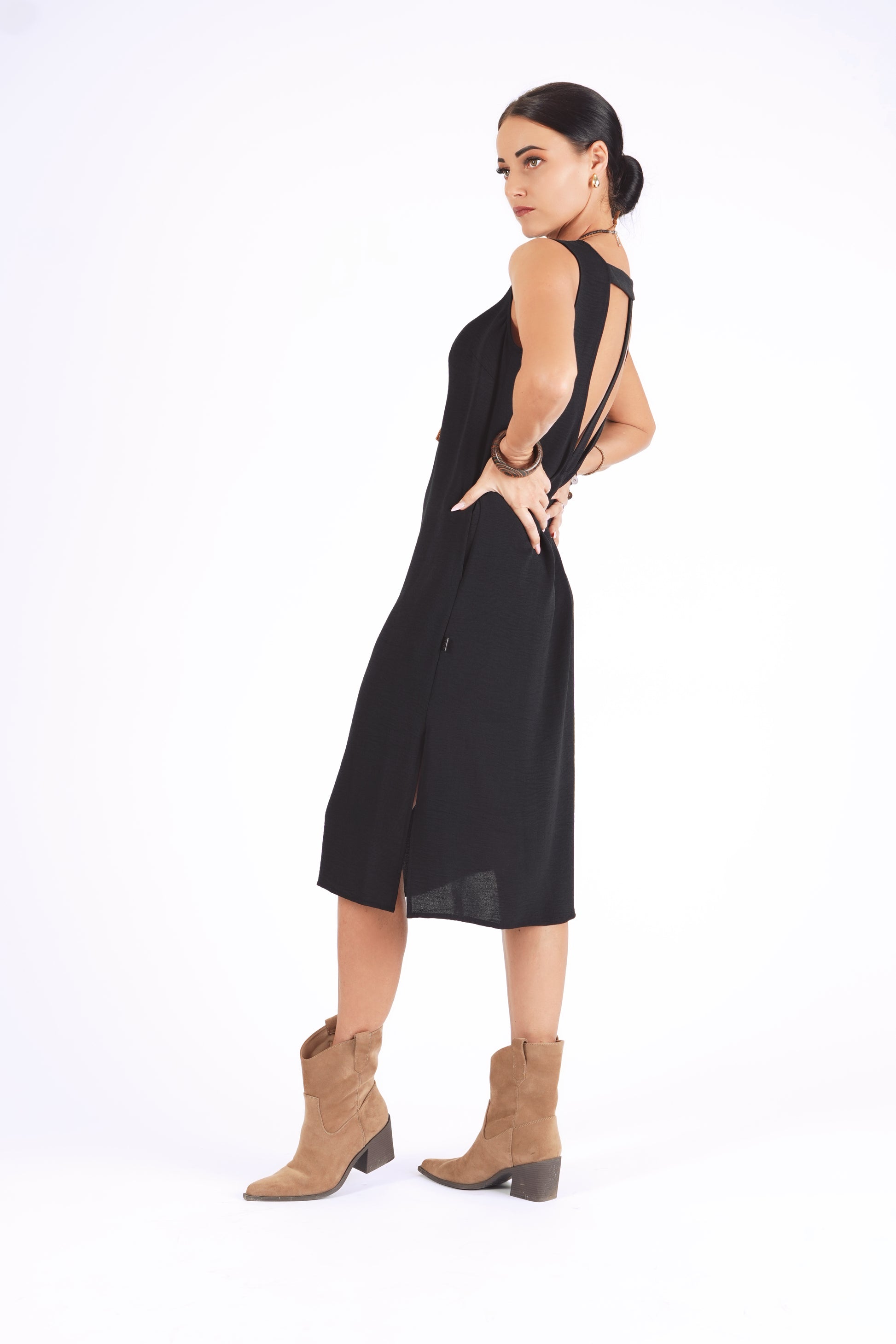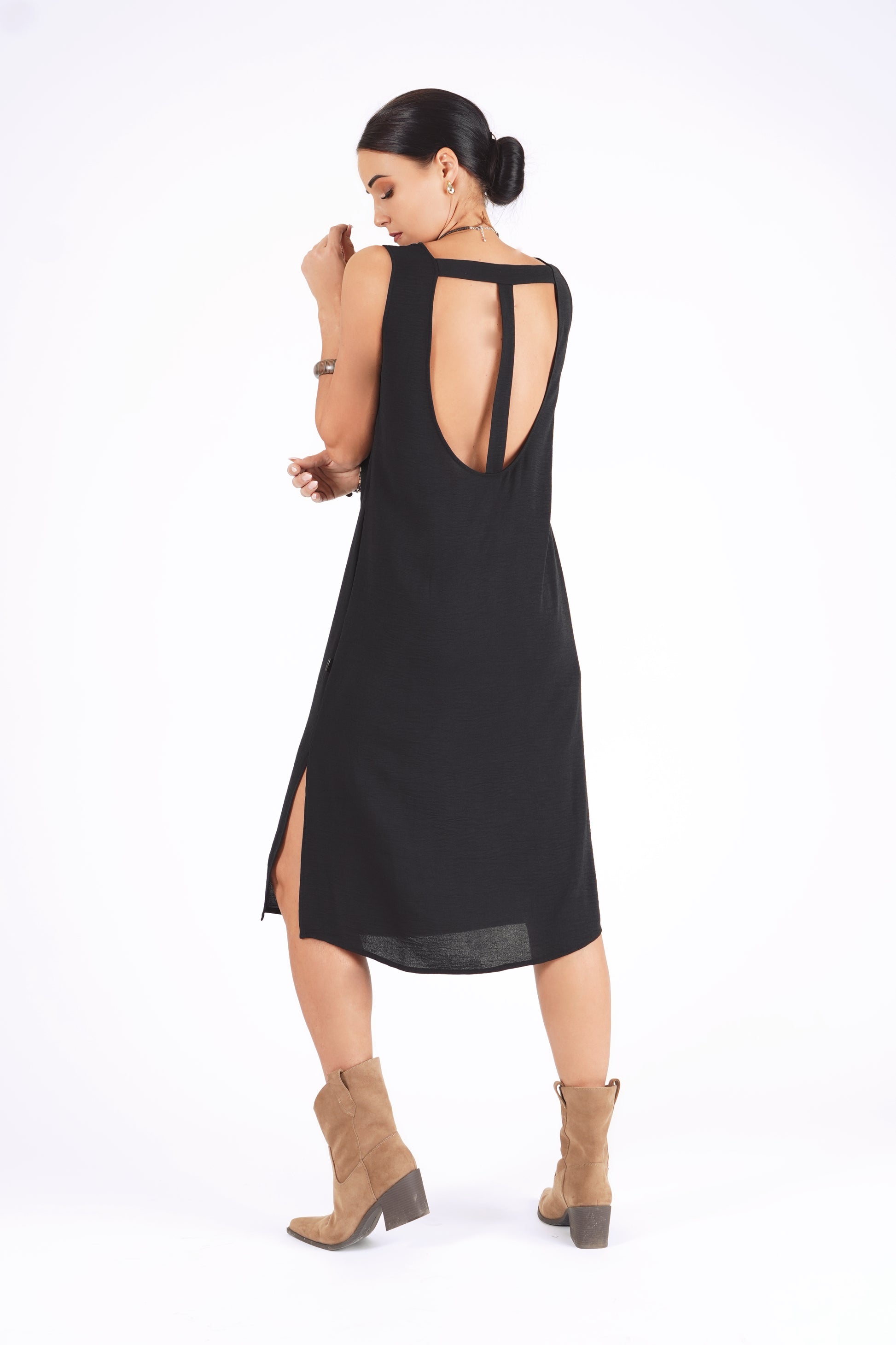Midi kleita ar sānu vīles kabatām, šķēlumu un orģinālu muguras izgriezuma dizainu.